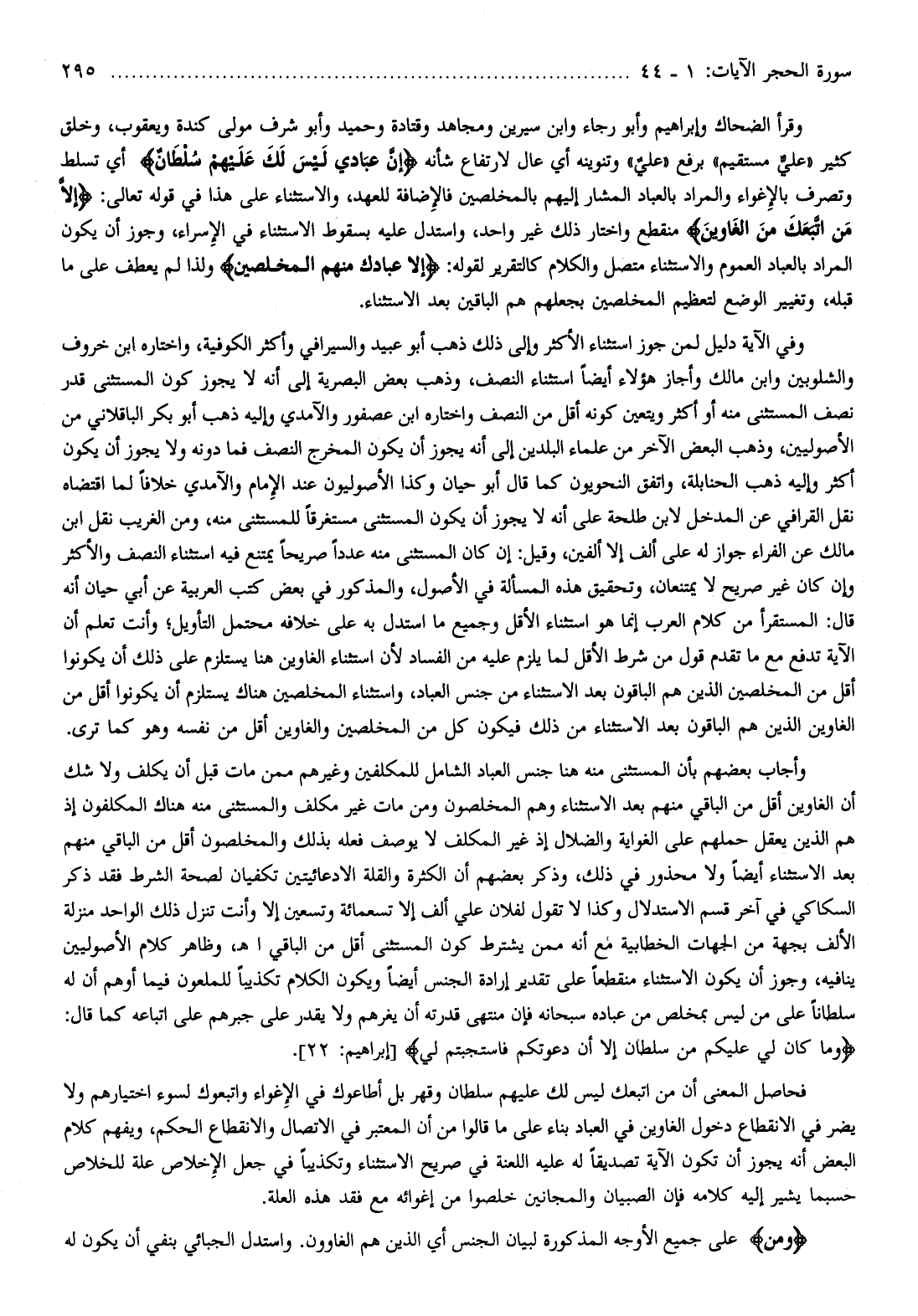 وفي الآية دليل لمن جوز استثناء الأكثر وإلى ذلك ذهب أبو عبيد والسيرافي وأكثر الكوفية، واختاره ابن خروف والشلوبين وابن مالك وأجاز هؤلاء أيضا استثناء النصف، وذهب بعض البصرية إلى أنه لا يجوز كون المستثنى قدر نصف المستثنى منه أو أكثر ويتعين كونه أقل من النصف واختاره ابن عصفور والآمدي وإليه ذهب أبو بكر الباقلاني من الأصوليين، وذهب البعض الآخر من علماء البلدين إلى أنه يجوز أن يكون المخرج النصف فما دونه ولا يجوز أن يكون أكثر وإليه ذهب الحنابلة، واتفق النحويون كما قال أبو حيان وكذا الأصوليون عند الإمام والآمدي خلافا لما اقتضاه نقل القرافي عن المدخل لابن طلحة على أنه لا يجوز أن يكون المستثنى مستغرقا للمستثنى منه، ومن الغريب نقل ابن مالك عن الفراء جواز له على ألف إلا ألفين، وقيل: إن كان المستثنى منه عددا صريحا يمتنع فيه استثناء النصف والأكثر وإن كان غير صريح لا يمتنعان، وتحقيق هذه المسألة في الأصول، والمذكور في بعض كتب العربية عن أبي حيان أنه قال: المستقرأ من كلام العرب إنما هو استثناء الأقل وجميع ما استدل به على خلافه محتمل التأويل وأنت تعلم أن الآية تدفع مع ما تقدم قول من شرط الأقل لما يلزم عليه من الفساد لأن استثناء الغاوين هنا يستلزم على ذلك أن يكونوا أقل من المخلصين الذين هم الباقون بعد الاستثناء من جنس العباد، واستثناء المخلصين هناك يستلزم أن يكونوا أقل من الغاوين الذين هم الباقون بعد الاستثناء من ذلك فيكون كل من المخلصين والغاوين أقل من نفسه وهو كما ترى.