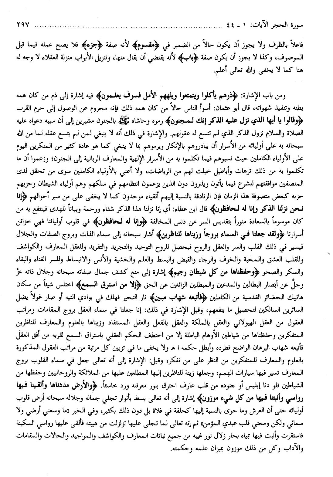 ومن باب الإشارة: ذَرْهُمْ يَأْكُلُوا وَيَتَمَتَّعُوا وَيُلْهِهِمُ الْأَمَلُ فَسَوْفَ يَعْلَمُونَ فيه إشارة إلى ذم من كان همه بطنه وتنفيذ شهواته، قال أبو عثمان: أسوأ الناس حالا من كان همه ذلك فإنه محروم عن الوصول إلى حرم القرب وَقالُوا يا أَيُّهَا الَّذِي نُزِّلَ عَلَيْهِ الذِّكْرُ إِنَّكَ لَمَجْنُونٌ رموه وحاشاه صلى الله عليه وسلم بالجنون مشيرين إلى أن سببه دعواه عليه الصلاة والسلام نزول الذكر الذي لم تتسع له عقولهم. والإشارة في ذلك أنه لا ينبغي لمن لم يتسع عقله لما من الله سبحانه به على أوليائه من الأسرار أن يبادروهم بالإنكار ويرموهم بما لا ينبغي كما هو عادة كثير من المنكرين اليوم على الأولياء الكاملين حيث نسبوهم فيما تكلموا به من الأسرار الإلهية والمعارف الربانية إلى الجنون وزعموا أن ما تكلموا به من ذلك ترهات وأباطيل خيلت لهم من الرياضات، ولا أعني بالأولياء الكاملين سوى من تحقق لدى المنصفين موافقتهم للشرع فيما يأتون ويذرون دون الذين يزعمون انتظامهم في سلكهم وهم أولياء الشيطان وحزبهم حزبه كبعض متصوفة هذا الزمان فإن الزنادقة بالنسبة إليهم أتقياء موحدون كما لا يخفى على من سبر أحوالهم إِنَّا نَحْنُ نَزَّلْنَا الذِّكْرَ وَإِنَّا لَهُ لَحافِظُونَ قال ابن عطاء: أي إنا نزلنا هذا الذكر شفاء ورحمة وبيانا للهدى فينتفع به من كان موسوما بالسعادة منورا بتقديس السر عن دنس المخالفة وَإِنَّا لَهُ لَحافِظُونَ في قلوب أوليائنا فهي خزائن أسرارنا وَلَقَدْ جَعَلْنا فِي السَّماءِ بُرُوجاً وَزَيَّنَّاها لِلنَّاظِرِينَ أشار سبحانه إلى سماء الذات وبروج الصفات والجلال فيسير في ذلك القلب والسر والعقل والروح فيحصل للروح التوحيد والتجريد والتفريد وللعقل المعارف والكواشف وللقلب العشق والمحبة والخوف والرجاء والقبض والبسط والعلم والخشية والأنس والانبساط وللسر الفناء والبقاء والسكر والصحو وَحَفِظْناها مِنْ كُلِّ شَيْطانٍ رَجِيمٍ إشارة إلى منع كشف جمال صفاته سبحانه وجلال ذاته عزّ وجلّ عن أبصار البطالين والمدعين والمبطلين الزائغين عن الحق إِلَّا مَنِ اسْتَرَقَ السَّمْعَ اختلس شيئا من سكان هاتيك الحضائر القدسية من الكاملين فَأَتْبَعَهُ شِهابٌ مُبِينٌ نار التحير فهلك في بوادي التيه أو صار غولا يضل السائرين السالكين لتحصيل ما ينفعهم، وقيل الإشارة في ذلك: إنا جعلنا في سماء العقل بروج المقامات ومراتب العقول من العقل الهيولاني والعقل بالملكة والعقل بالفعل والعقل المستفاد وزيناها بالعلوم والمعارف للناظرين المتفكرين وحفظناها من شياطين الأوهام الباطلة إلا من اختطف الحكم العقلي باستراق السمع لقربه من أفق العقل فأتبعه شهاب البرهان الواضح فطرده وأبطل حكمه اه ولا يخفى ما في تزيين كل مرتبة من مراتب العقول المذكورة بالعلوم والمعارف للمتفكرين من النظر على من تفكر، وقيل: الإشارة إلى أنه تعالى جعل في سماء القلوب بروج المعارف تسير فيها سيارات الهمم، وجعلها زينة للناظرين إليها المطلعين عليها من الملائكة والروحانيين وحفظها من الشياطين فلو دنا إبليس أو جنوده من قلب عارف احترق بنور معرفته ورد خاسئا. وَالْأَرْضَ مَدَدْناها وَأَلْقَيْنا فِيها رَواسِيَ وَأَنْبَتْنا فِيها مِنْ كُلِّ شَيْءٍ مَوْزُونٍ إشارة إلى أنه تعالى بسط بأنوار تجلي جماله وجلاله سبحانه أرض قلوب أوليائه حتى أن العرش وما حوى بالنسبة إليها كحلقة في فلاة بل دون ذلك بكثير،