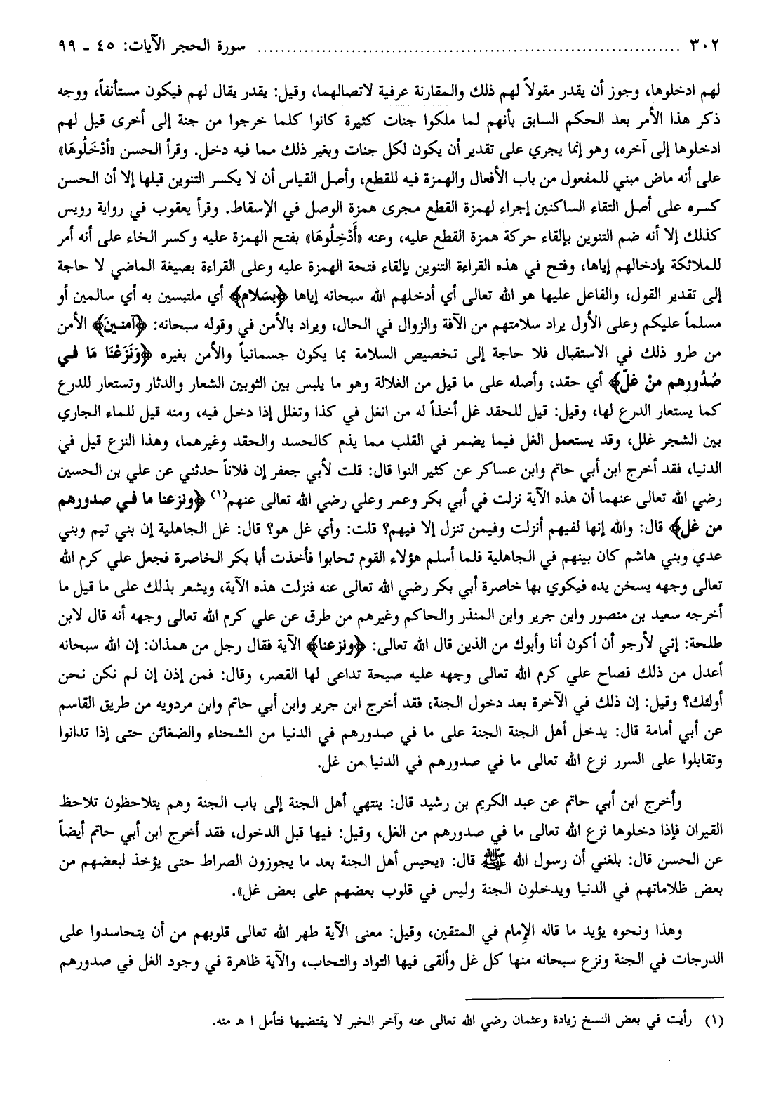 أخرجه سعيد بن منصور وابن جرير وابن المنذر والحاكم وغيرهم من طرق عن علي كرم الله تعالى وجهه أنه قال لابن طلحة: إني لأرجو أن أكون أنا وأبوك من الذين قال الله تعالى: وَنَزَعْنا الآية فقال رجل من همذان: إن الله سبحانه أعدل من ذلك فصاح علي كرم الله تعالى وجهه عليه صيحة تداعى لها القصر، وقال: فمن إذن إن لم نكن نحن أولئك؟ وقيل: إن ذلك في الآخرة بعد دخول الجنة،