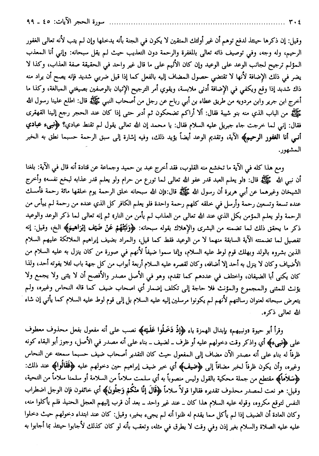 ثم إنه تعالى لما ذكر الوعد والوعيد ذكر ما يحقق ذلك لما تضمنه من البشرى والإهلاك بقوله سبحانه: وَنَبِّئْهُمْ عَنْ ضَيْفِ إِبْراهِيمَ إلخ، وقيل: إنه تفصيل لما تضمنته الآية السابقة منهما لا من الوعيد فقط كما قيل، والمراد بضيف إبراهيم الملائكة عليهم السلام الذين بشروه بالولد وبهلك قوم لوط عليه السلام، وإنما سموا ضيفا لأنهم في صورة من كان ينزل به عليه السلام من الأضياف وكان لا ينزل به أحد إلا أضافه، وكان لقصره عليه السلام أربعة أبواب من كل جهة باب لئلا يفوته أحد، ولذا كان يكنى أبا الضيفان، واختلف في عددهم كما تقدم، وهو في الأصل مصدر والأفصح أن لا يثنى ولا يجمع ولا يؤنث للمثنى والمجموع والمؤنث فلا حاجة إلى تكلف إضمار أي اصحاب ضيف كما قاله النحاس وغيره، ولم يتعرض سبحانه لعنوان رسالتهم لأنهم لم يكونوا مرسلين إليه عليه السلام بل إلى قوم لوط عليه السلام كما يأتي إن شاء الله تعالى ذكره.