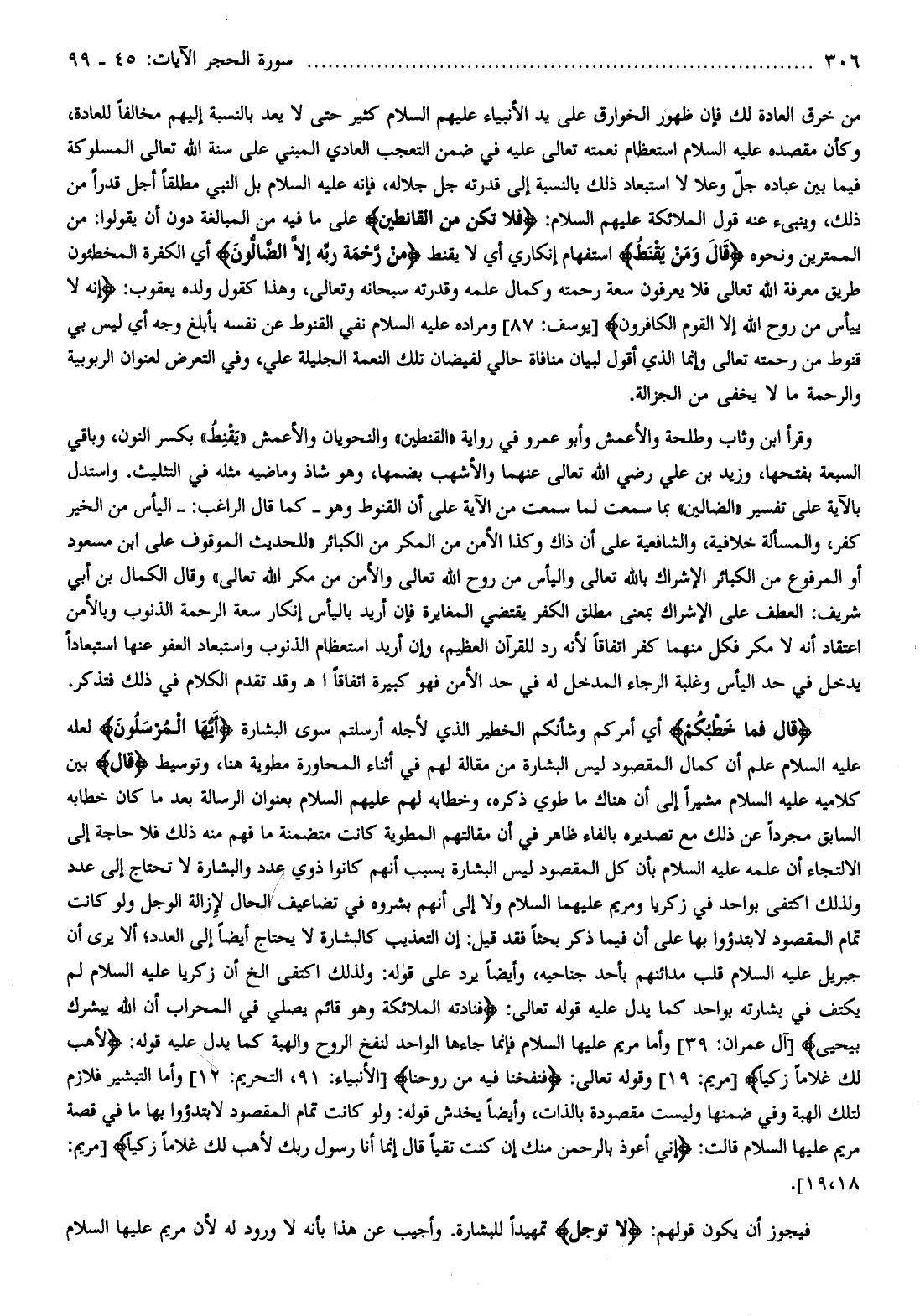 من خرق العادة لك فإن ظهور الخوارق على يد الأنبياء عليهم السلام كثير حتى لا يعد بالنسبة إليهم مخالفا للعادة، وكأن مقصده عليه السلام استعظام نعمته تعالى عليه في ضمن التعجب العادي المبني على سنة الله تعالى المسلوكة فيما بين عباده جلّ وعلا لا استبعاد ذلك بالنسبة إلى قدرته جل جلاله، فإنه عليه السلام بل النبي مطلقا أجل قدرا من ذلك، وينبئ عنه قول الملائكة عليهم السلام: فَلا تَكُنْ مِنَ الْقانِطِينَ على ما فيه من المبالغة دون أن يقولوا: من الممترين ونحوه قالَ وَمَنْ يَقْنَطُ استفهام إنكاري أي لا يقنط مِنْ رَحْمَةِ رَبِّهِ إِلَّا الضَّالُّونَ أي الكفرة المخطئون طريق معرفة الله تعالى فلا يعرفون سعة رحمته وكمال علمه وقدرته سبحانه وتعالى، وهذا كقول ولده يعقوب: إِنَّهُ لا يَيْأَسُ مِنْ رَوْحِ اللَّهِ إِلَّا الْقَوْمُ الْكافِرُونَ [يوسف: 87] ومراده عليه السلام نفي القنوط عن نفسه بأبلغ وجه أي ليس بي قنوط من رحمته تعالى وإنما الذي أقول لبيان منافاة حالي لفيضان تلك النعمة الجليلة علي، وفي التعرض لعنوان الربوبية والرحمة ما لا يخفى من الجزالة.