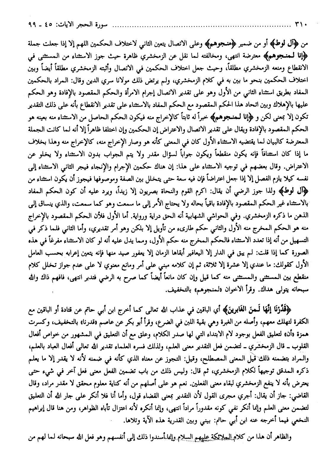 من آلَ لُوطٍ أو من ضمير لَمُنَجُّوهُمْ وعلى الاتصال يتعين الثاني لاختلاف الحكمين اللهم إلا إذا جعلت جملة إِنَّا لَمُنَجُّوهُمْ معترضة انتهى، ومخالفته لما نقل عن الزمخشري ظاهرة حيث جوز الاستثناء من المستثنى في الانقطاع ومنعه الزمخشري مطلقا، وحيث جعل اختلاف الحكمين في الاتصال وأثبته الزمخشري مطلقا أيضا وبين اختلاف الحكمين بنحو ما بين به في كلام الزمخشري، ولم يرتض ذلك مولانا سري الدين وقال: المراد بالحكمين المفاد بطريق استثناء الثاني من الأول وهو على تقدير الاتصال إجرام الامرأة والحكم المقصود بالإفادة وهو الحكم عليها بالإهلاك وبين اتحاد هذا الحكم المقصود مع الحكم المفاد بالاستثناء على تقدير الانقطاع بأنه على ذلك التقدير تكون إلا بمعنى لكن وإِنَّا لَمُنَجُّوهُمْ خبرا له ثابتا كالإخراج منه فيكون الحكم الحاصل من الاستثناء منه بعينه هو الحكم المقصود بالإفادة ويقال على تقدير الاتصال والاعتراض إن الحكمين وإن اختلفا ظاهرا إلا أنه لما كانت الجملة المعترضة كالبيان لما يقتضيه الاستثناء الأول كان في المعنى كأنه هو وصار الإخراج منه، كالإخراج منه وهذا بخلاف ما إذا كان استئنافا فإنه يكون منقطعا ويكون جوابا لسؤال مقدر ولا يتم الجواب بدون الاستثناء ولا يخلو عن الاعتراض. وقال بعضهم في توجيه الاستثناء على هذا: إن هناك حكمين الإجرام والإنجاء فيجر الثاني الاستثناء إلى نفسه كيلا يلزم الفصل إلا إذا جعل اعتراضا فإن فيه سعة حتى يتخلل بين الصفة وموصوفها فيجوز أن يكون استثناء من آلَ لُوطٍ ولذا جوز الرضي أن يقال: أكرم القوم والنحاة بصريون إلا زيدا، ويرد عليه أن كون الحكم المفاد بالاستثناء غير الحكم المقصود بالإفادة باقيا بحاله ولا يحتاج الأمر إلى ما سمعت وهو كما سمعت، والذي ينساق إلى الذهن ما ذكره الزمخشري. وفي الحواشي الشهابية أنه الحق دراية ورواية. أما الأول فلأن الحكم المقصود بالإخراج منه هو الحكم المخرج منه الأول والثاني حكم طارئ من تأويل إلا بلكن وهو أمر تقديري، وأما الثاني فلما ذكر في التسهيل من أنه إذا تعدد الاستثناء فالحكم المخرج منه حكم الأول، ومما يدل عليه أنه لو كان الاستثناء مفرغا في هذه الصورة كما إذا قلت: لم يبق في الدار إلا اليعافير أبقاها الزمان إلا يعفور صيد منها فإنه يتعين إعرابه بحسب العامل الأول كقولك: ما عندي إلا عشرة إلا ثلاثة، ثم إن كلامه مبني على أمر ومانع معنوي لا على عدم جواز تخلل كلام منقطع بين المستثنى والمستثنى منه كما قيل وإن كان مانعا أيضا كما صرح به الرضي فتدبر انتهى، فافهم ذاك والله سبحانه يتولى هداك. وقرأ الاخوان «لمنجوهم» بالتخفيف.