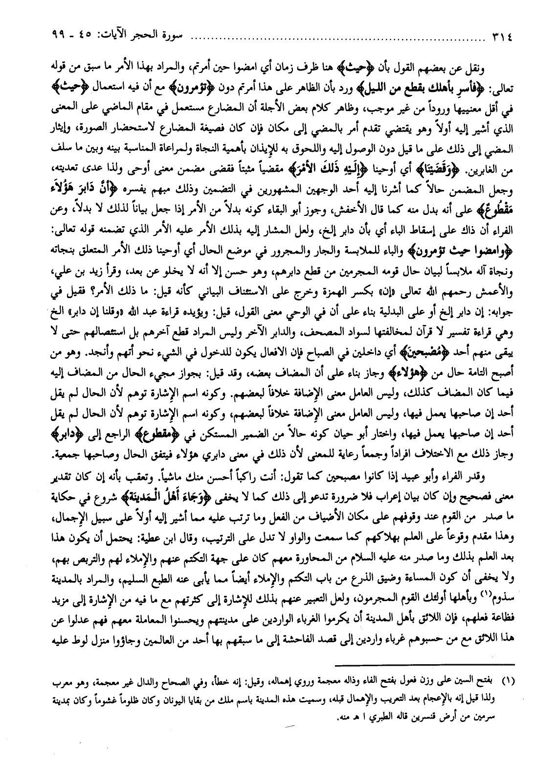 وقدر الفراء وأبو عبيد إذا كانوا مصبحين كما تقول: أنت راكبا أحسن منك ماشيا. وتعقب بأنه إن كان تقدير معنى فصيح وإن كان بيان إعراب فلا ضرورة تدعو إلى ذلك كما لا يخفى وَجاءَ أَهْلُ الْمَدِينَةِ شروع في حكاية ما صدر من القوم عند وقوفهم على مكان الأضياف من الفعل وما ترتب عليه مما أشير إليه أولا على سبيل الإجمال، وهذا مقدم وقوعا على العلم بهلاكهم كما سمعت والواو لا تدل على الترتيب، وقال ابن عطية: يحتمل أن يكون هذا بعد العلم بذلك وما صدر منه عليه السلام من المحاورة معهم كان على جهة التكتم عنهم والإملاء لهم والتربص بهم، ولا يخفى أن كون المساءة وضيق الذرع من باب التكتم والإملاء أيضا مما يأبى عنه الطبع السليم، والمراد بالمدينة سذوم (¬1) وبأهلها أولئك القوم المجرمون، ولعل التعبير عنهم بذلك للإشارة إلى كثرتهم مع ما فيه من الإشارة إلى مزيد فظاعة فعلهم، فإن اللائق بأهل المدينة أن يكرموا الغرباء الواردين على مدينتهم ويحسنوا المعاملة معهم فهم عدلوا عن هذا اللائق مع من حسبوهم غرباء واردين إلى قصد الفاحشة إلى ما سبقهم بها أحد من العالمين وجاؤوا منزل لوط عليه