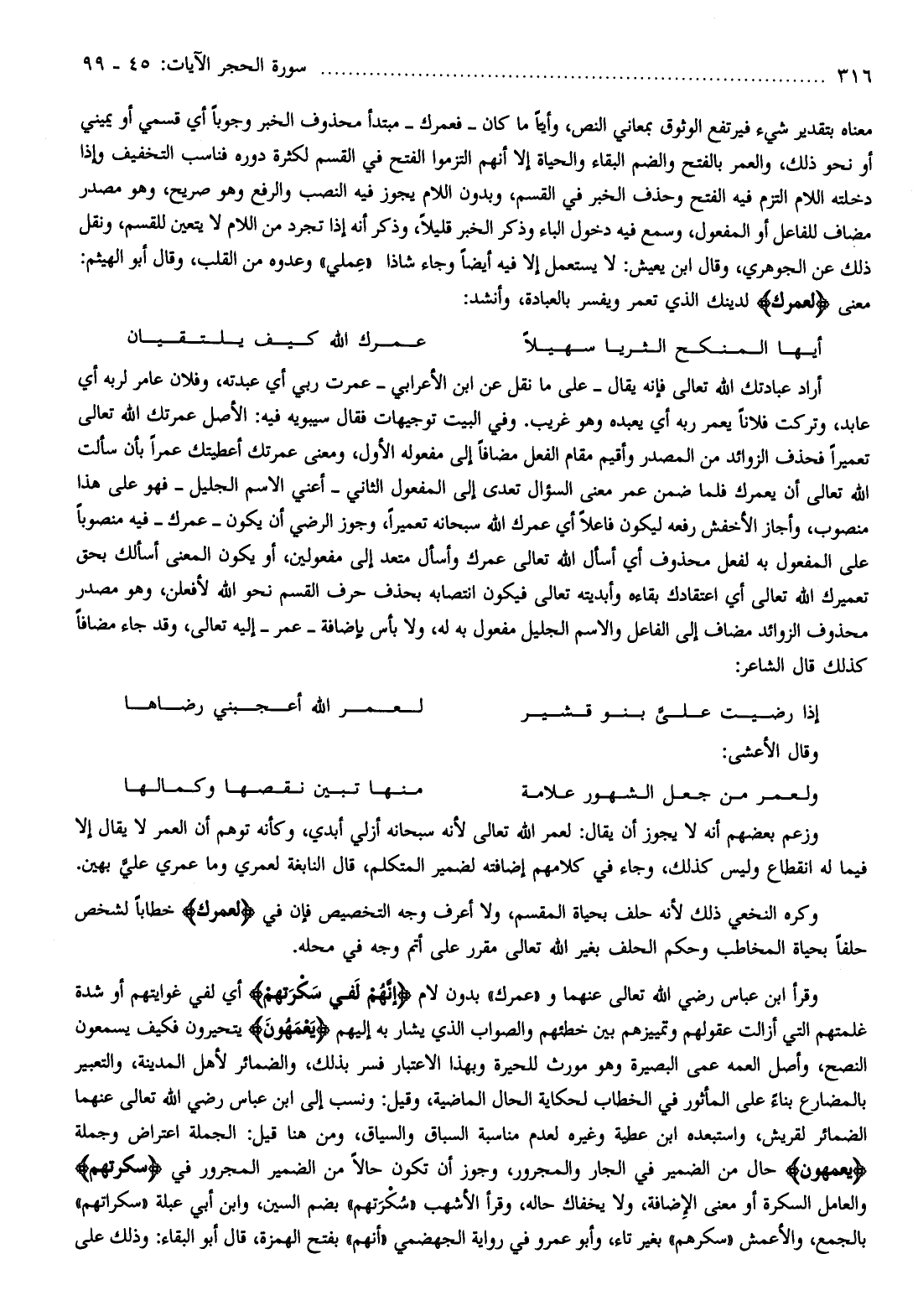 معناه بتقدير شيء فيرتفع الوثوق بمعاني النص، وأيّا ما كان- فعمرك- مبتدأ محذوف الخبر وجوبا أي قسمي أو يميني أو نحو ذلك، والعمر بالفتح والضم البقاء والحياة إلا أنهم التزموا الفتح في القسم لكثرة دوره فناسب التخفيف وإذا دخلته اللام التزم فيه الفتح وحذف الخبر في القسم، وبدون اللام يجوز فيه النصب والرفع وهو صريح، وهو مصدر مضاف للفاعل أو المفعول، وسمع فيه دخول الباء وذكر الخبر قليلا، وذكر أنه إذا تجرد من اللام لا يتعين للقسم، ونقل ذلك عن الجوهري، وقال ابن يعيش: لا يستعمل إلا فيه أيضا وجاء شاذا «عملي» وعدوه من القلب، وقال أبو الهيثم: