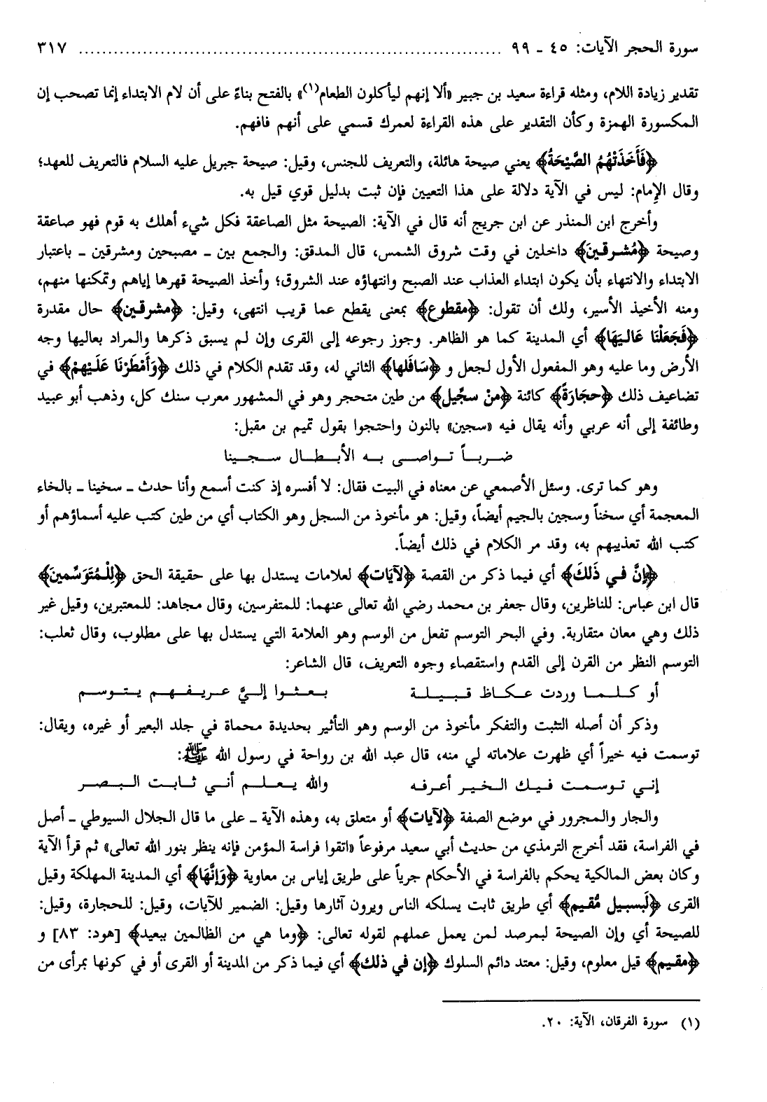 وأخرج ابن المنذر عن ابن جريج أنه قال في الآية: الصيحة مثل الصاعقة فكل شيء أهلك به قوم فهو صاعقة وصيحة مُشْرِقِينَ داخلين في وقت شروق الشمس، قال المدقق: والجمع بين- مصبحين ومشرقين- باعتبار الابتداء والانتهاء بأن يكون ابتداء العذاب عند الصبح وانتهاؤه عند الشروق وأخذ الصيحة قهرها إياهم وتمكنها منهم، ومنه الأخيذ الأسير، ولك أن تقول: مَقْطُوعٌ بمعنى يقطع عما قريب انتهى، وقيل: مُشْرِقِينَ حال مقدرة فَجَعَلْنا عالِيَها أي المدينة كما هو الظاهر. وجوز رجوعه إلى القرى وإن لم يسبق ذكرها والمراد بعاليها وجه الأرض وما عليه وهو المفعول الأول لجعل وسافِلَها الثاني له، وقد تقدم الكلام في ذلك وَأَمْطَرْنا عَلَيْهِمْ في تضاعيف ذلك حِجارَةً كائنة مِنْ سِجِّيلٍ من طين متحجر وهو في المشهور معرب سنك كل، وذهب أبو عبيد وطائفة إلى أنه عربي وأنه يقال فيه «سجين» بالنون واحتجوا بقول تميم بن مقبل:
