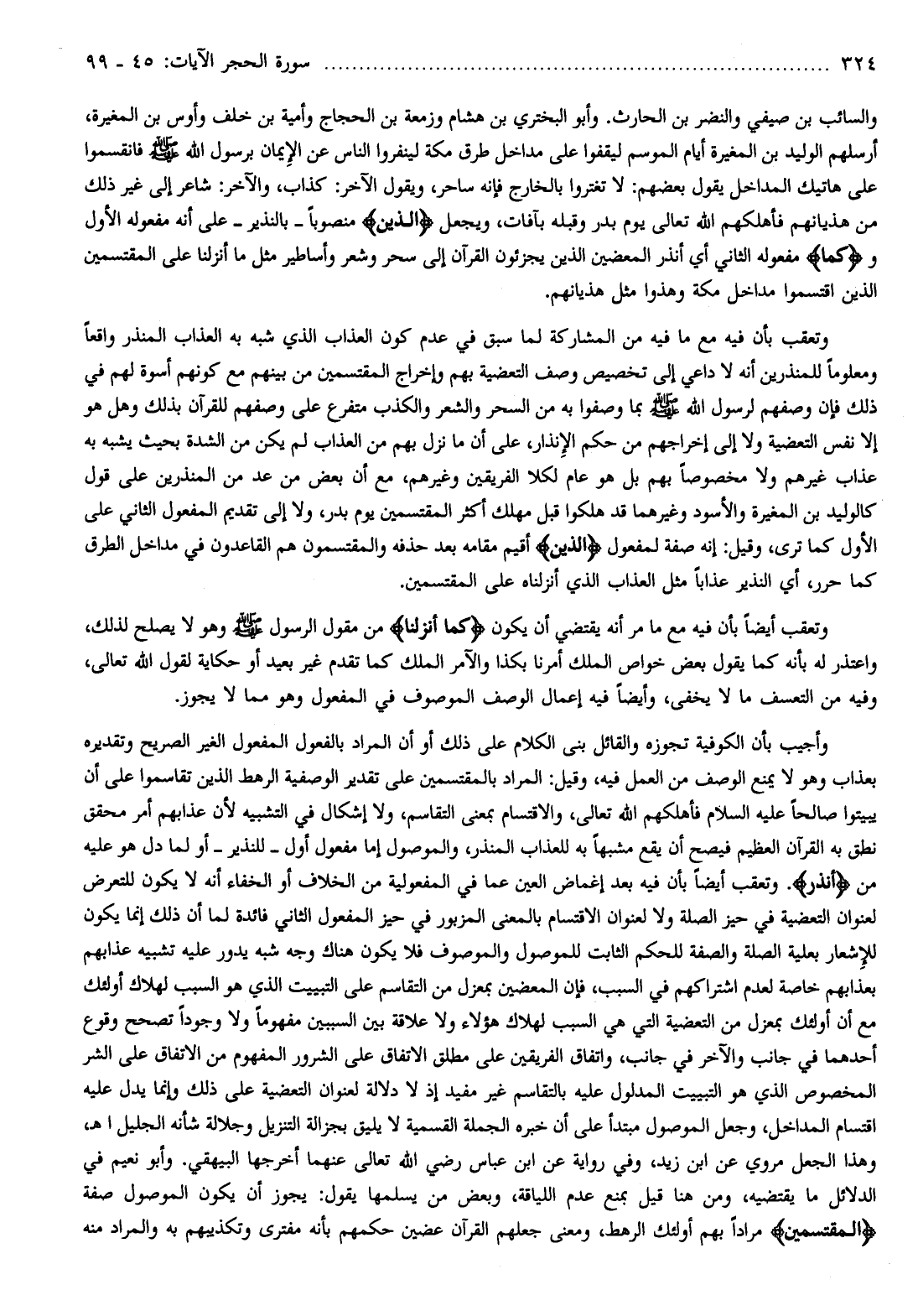 وأجيب بأن الكوفية تجوزه والقائل بنى الكلام على ذلك أو أن المراد بالمفعول المفعول الغير الصريح وتقديره بعذاب وهو لا يمنع الوصف من العمل فيه، وقيل: المراد بالمقتسمين على تقدير الوصفية الرهط الذين تقاسموا على أن يبيتوا صالحا عليه السلام فأهلكهم الله تعالى، والاقتسام بمعنى التقاسم، ولا إشكال في التشبيه لأن عذابهم أمر محقق نطق به القرآن العظيم فيصح أن يقع مشبها به للعذاب المنذر، والموصول إما مفعول أول- للنذير- أو لما دل هو عليه من أنذر. وتعقب أيضا بأن فيه بعد إغماض العين عما في المفعولية من الخلاف أو الخفاء أنه لا يكون للتعرض لعنوان التعضية في حيز الصلة ولا لعنوان الاقتسام بالمعنى المزبور في حيز المفعول الثاني فائدة لما أن ذلك إنما يكون للإشعار بعلية الصلة والصفة للحكم الثابت للموصول والموصوف فلا يكون هناك وجه شبه يدور عليه تشبيه عذابهم بعذابهم خاصة لعدم اشتراكهم في السبب، فإن المعضين بمعزل من التقاسم على التبييت الذي هو السبب لهلاك أولئك مع أن أولئك بمعزل من التعضية التي هي السبب لهلاك هؤلاء ولا علاقة بين السببين مفهوما ولا وجودا تصحح وقوع أحدهما في جانب والآخر في جانب، واتفاق الفريقين على مطلق الاتفاق على الشرور المفهوم من الاتفاق على الشر المخصوص الذي هو التبييت المدلول عليه بالتقاسم غير مفيد إذ لا دلالة لعنوان التعضية على ذلك وإنما يدل عليه اقتسام المداخل، وجعل الموصول مبتدأ على أن خبره الجملة القسمية لا يليق بجزالة التنزيل وجلالة شأنه الجليل اه، وهذا الجعل مروي عن ابن زيد، وفي رواية عن ابن عباس رضي الله تعالى عنهما أخرجها البيهقي. وأبو نعيم في الدلائل ما يقتضيه، ومن هنا قيل بمنع عدم اللياقة، وبعض من يسلمها يقول: يجوز أن يكون الموصول صفة الْمُقْتَسِمِينَ مرادا بهم أولئك الرهط، ومعنى جعلهم القرآن عضين حكمهم بأنه مفترى وتكذيبهم به والمراد منه