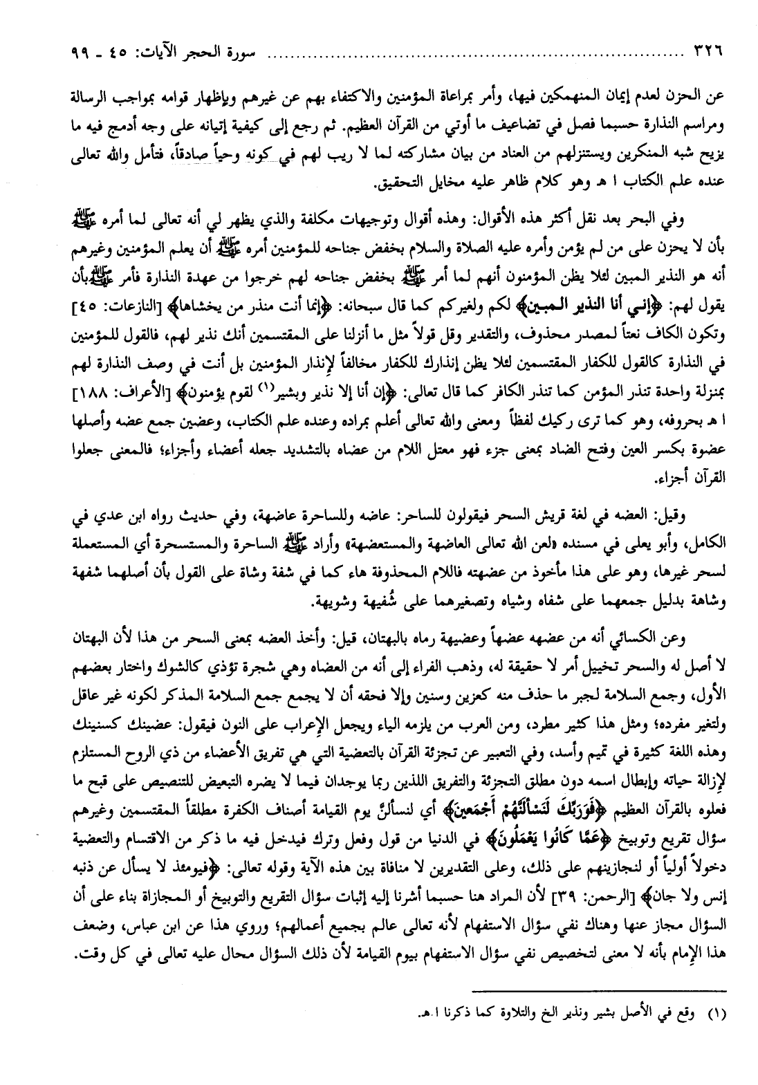 وعن الكسائي أنه من عضهه عضها وعضيهة رماه بالبهتان، قيل: وأخذ العضه بمعنى السحر من هذا لأن البهتان لا أصل له والسحر تخييل أمر لا حقيقة له، وذهب الفراء إلى أنه من العضاه وهي شجرة تؤذي كالشوك واختار بعضهم الأول، وجمع السلامة لجبر ما حذف منه كعزين وسنين وإلا فحقه أن لا يجمع جمع السلامة المذكر لكونه غير عاقل ولتغير مفرده ومثل هذا كثير مطرد، ومن العرب من يلزمه الياء ويجعل الإعراب على النون فيقول: عضينك كسنينك وهذه اللغة كثيرة في تميم وأسد، وفي التعبير عن تجزئة القرآن بالتعضية التي هي تفريق الأعضاء من ذي الروح المستلزم لإزالة حياته وإبطال اسمه دون مطلق التجزئة والتفريق اللذين ربما يوجدان فيما لا يضره التبعيض للتنصيص على قبح ما فعلوه بالقرآن العظيم فَوَ رَبِّكَ لَنَسْئَلَنَّهُمْ أَجْمَعِينَ أي لنسألنّ يوم القيامة أصناف الكفرة مطلقا المقتسمين وغيرهم سؤال تقريع وتوبيخ عَمَّا كانُوا يَعْمَلُونَ في الدنيا من قول وفعل وترك فيدخل فيه ما ذكر من الاقتسام والتعضية دخولا أوليا أو لنجازينهم على ذلك، وعلى التقديرين لا منافاة بين هذه الآية وقوله تعالى: فَيَوْمَئِذٍ لا يُسْئَلُ عَنْ ذَنْبِهِ إِنْسٌ وَلا جَانٌّ [الرحمن: 39] لأن المراد هنا حسبما أشرنا إليه إثبات سؤال التقريع والتوبيخ أو المجازاة بناء على أن السؤال مجاز عنها وهناك نفي سؤال الاستفهام لأنه تعالى عالم بجميع أعمالهم وروي هذا عن ابن عباس، وضعف هذا الإمام بأنه لا معنى لتخصيص نفي سؤال الاستفهام بيوم القيامة لأن ذلك السؤال محال عليه تعالى في كل وقت.