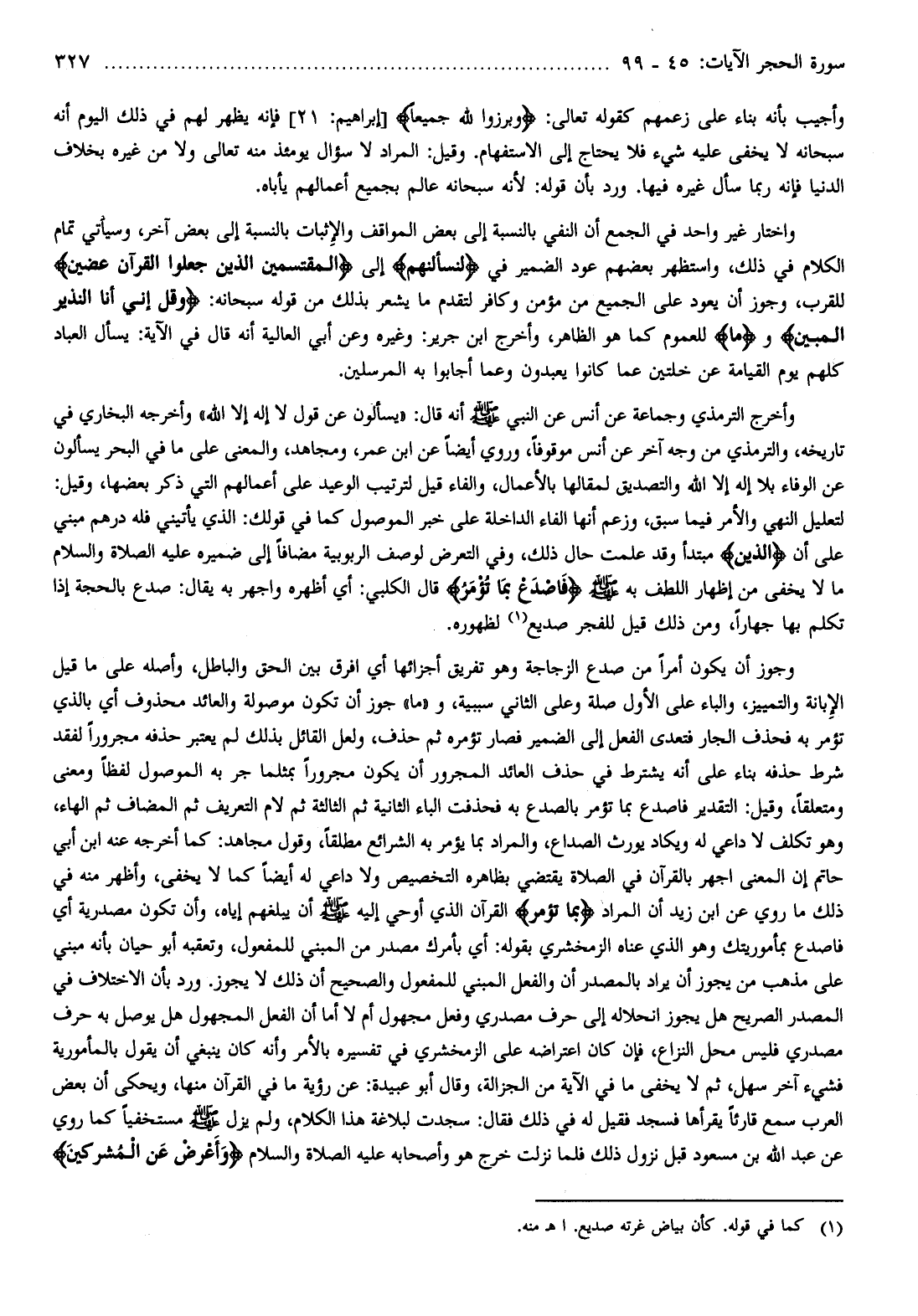 وجوز أن يكون أمرا من صدع الزجاجة وهو تفريق أجزائها أي افرق بين الحق والباطل، وأصله على ما قيل الإبانة والتمييز، والباء على الأول صلة وعلى الثاني سببية، و «ما» جوز أن تكون موصولة والعائد محذوف أي بالذي تؤمر به فحذف الجار فتعدى الفعل إلى الضمير فصار تؤمره ثم حذف، ولعل القائل بذلك لم يعتبر حذفه مجرورا لفقد شرط حذفه بناء على أنه يشترط في حذف العائد المجرور أن يكون مجرورا بمثلما جر به الموصول لفظا ومعنى ومتعلقا، وقيل: التقدير فاصدع بما تؤمر بالصدع به فحذفت الباء الثانية ثم الثالثة ثم لام التعريف ثم المضاف ثم الهاء، وهو تكلف لا داعي له ويكاد يورث الصداع، والمراد بما يؤمر به الشرائع مطلقا، وقول مجاهد: كما أخرجه عنه ابن أبي حاتم إن المعنى اجهر بالقرآن في الصلاة يقتضي بظاهره التخصيص ولا داعي له أيضا كما لا يخفى، وأظهر منه في ذلك ما روي عن ابن زيد أن المراد بِما تُؤْمَرُ القرآن الذي أوحي إليه صلى الله عليه وسلم أن يبلغهم إياه، وأن تكون مصدرية أي فاصدع بمأموريتك وهو الذي عناه الزمخشري بقوله: أي بأمرك مصدر من المبني للمفعول، وتعقبه أبو حيان بأنه مبني على مذهب من يجوز أن يراد بالمصدر أن والفعل المبني للمفعول والصحيح أن ذلك لا يجوز. ورد بأن الاختلاف في المصدر الصريح هل يجوز انحلاله إلى حرف مصدري وفعل مجهول أم لا أما أن الفعل المجهول هل يوصل به حرف مصدري فليس محل النزاع، فإن كان اعتراضه على الزمخشري في تفسيره بالأمر وأنه كان ينبغي أن يقول بالمأمورية فشيء آخر سهل، ثم لا يخفى ما في الآية من الجزالة، وقال أبو عبيدة: عن رؤية ما في القرآن منها، ويحكى أن بعض العرب سمع قارئا يقرأها فسجد فقيل له في ذلك فقال: سجدت لبلاغة هذا الكلام، ولم يزل صلى الله عليه وسلم مستخفيا كما روي عن عبد الله بن مسعود قبل نزول ذلك فلما نزلت خرج هو وأصحابه عليه الصلاة والسلام وَأَعْرِضْ عَنِ الْمُشْرِكِينَ