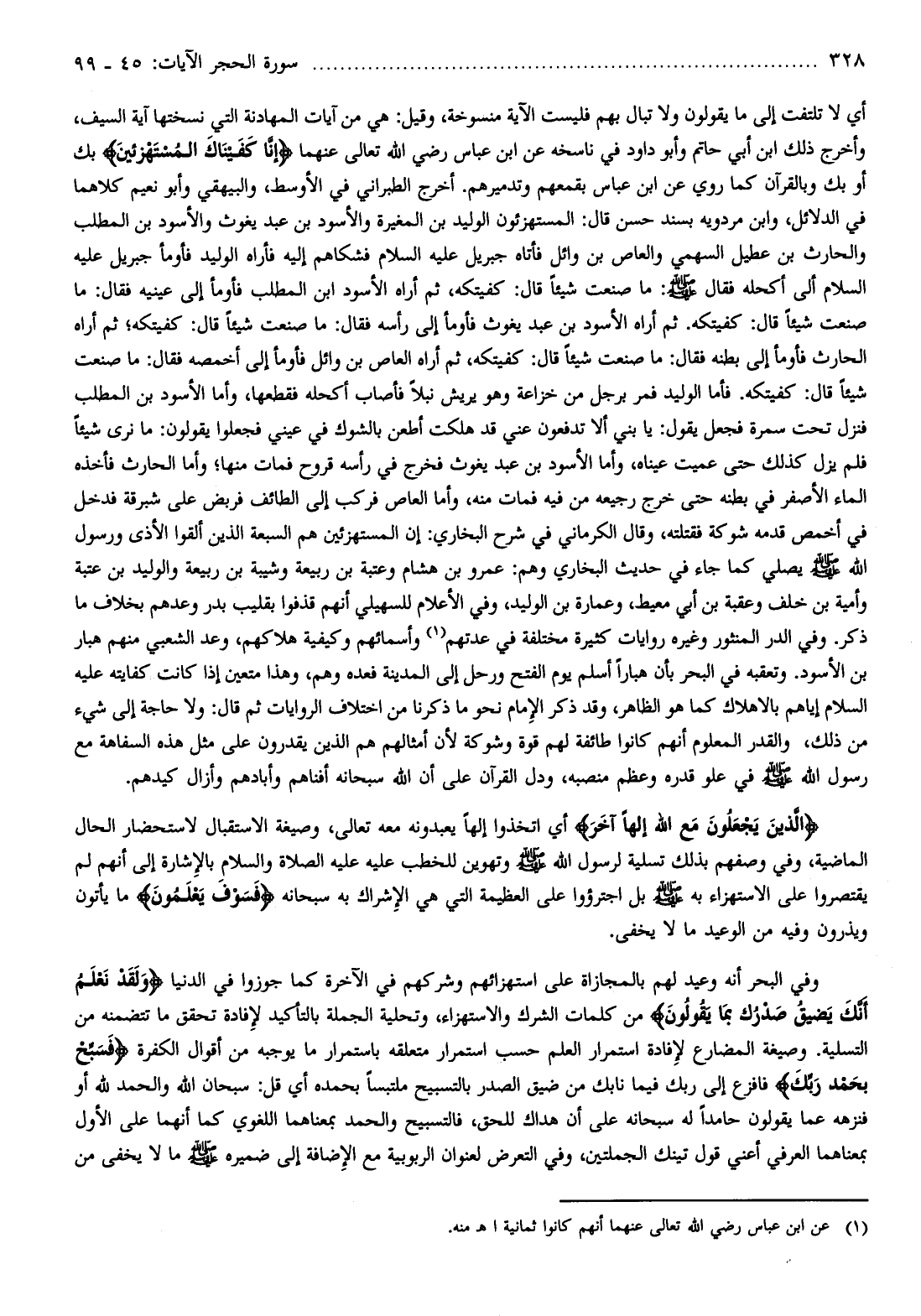 وقال الكرماني في شرح البخاري: إن المستهزئين هم السبعة الذين ألقوا الأذى ورسول الله صلى الله عليه وسلم يصلي كما جاء في حديث البخاري وهم: عمرو بن هشام وعتبة بن ربيعة وشيبة بن ربيعة والوليد بن عتبة وأمية بن خلف وعقبة بن أبي معيط، وعمارة بن الوليد، وفي الأعلام للسهيلي أنهم قذفوا بقليب بدر وعدهم بخلاف ما ذكر. وفي الدر المنثور وغيره روايات كثيرة مختلفة في عدتهم (¬1) وأسمائهم وكيفية هلاكهم وعد الشعبي منهم هبار بن الأسود. وتعقبه في البحر بأن هبارا أسلم يوم الفتح ورحل إلى المدينة فعده وهم، وهذا متعين إذا كانت كفايته عليه السلام إياهم بالإهلاك كما هو الظاهر، وقد ذكر الإمام نحو ما ذكرنا من اختلاف الروايات ثم قال: ولا حاجة إلى شيء من ذلك، والقدر المعلوم أنهم كانوا طائفة لهم قوة وشوكة لأن أمثالهم هم الذين يقدرون على مثل هذه السفاهة مع رسول الله صلى الله عليه وسلم في علو قدره وعظم منصبه، ودل القرآن على أن الله سبحانه أفناهم وأبادهم وأزال كيدهم.