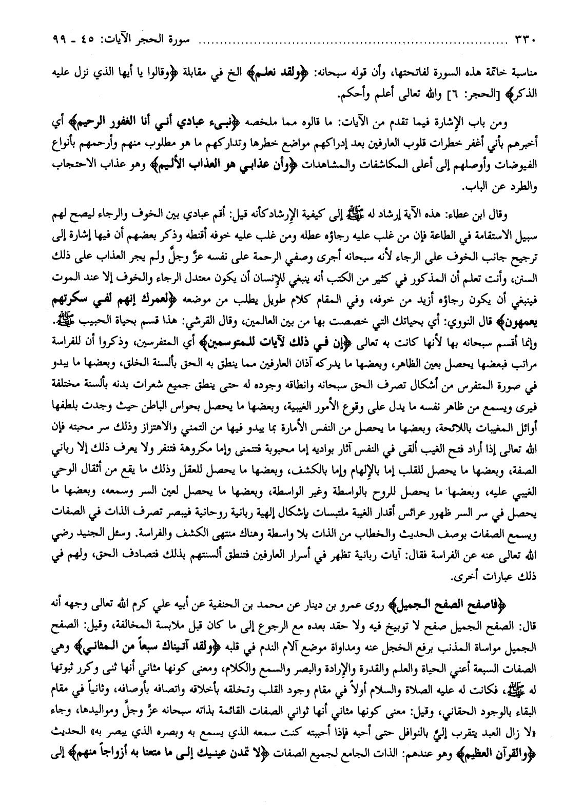 وقيل: الصفح الجميل مواساة المذنب برفع الخجل عنه ومداواة موضع آلام الندم في قلبه وَلَقَدْ آتَيْناكَ سَبْعاً مِنَ الْمَثانِي وهي الصفات السبعة أعني الحياة والعلم والقدرة والإرادة والبصر والسمع والكلام، ومعنى كونها مثاني أنها ثنى وكرر ثبوتها له صلى الله عليه وسلم، فكانت له عليه الصلاة والسلام أولا في مقام وجود القلب وتخلقه بأخلاقه واتصافه بأوصافه، وثانيا في مقام البقاء بالوجود الحقاني، وقيل: معنى كونها مثاني أنها ثواني الصفات القائمة بذاته سبحانه عزّ وجلّ ومواليدها،