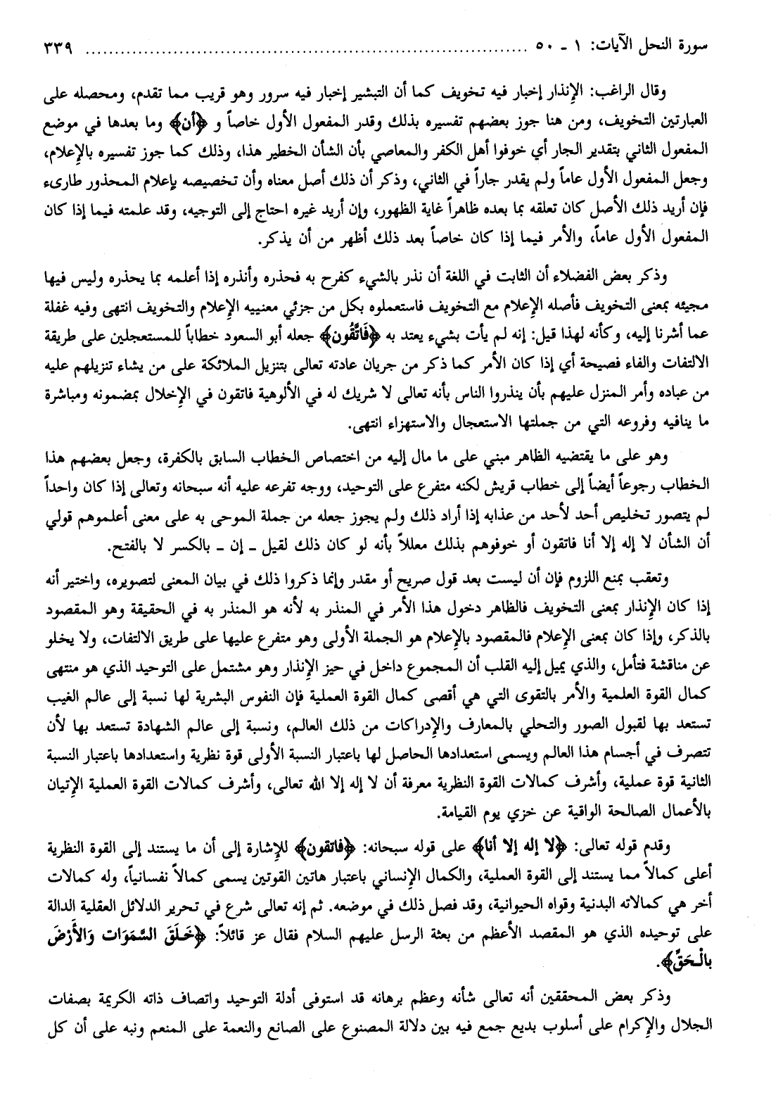 وقدم قوله تعالى: لا إِلهَ إِلَّا أَنَا على قوله سبحانه: فَاتَّقُونِ للإشارة إلى أن ما يستند إلى القوة النظرية أعلى كمالا مما يستند إلى القوة العملية، والكمال الإنساني باعتبار هاتين القوتين يسمى كمالا نفسانيا، وله كمالات أخر هي كمالاته البدنية وقواه الحيوانية، وقد فصل ذلك في موضعه. ثم إنه تعالى شرع في تحرير الدلائل العقلية الدالة على توحيده الذي هو المقصد الأعظم من بعثة الرسل عليهم السلام فقال عز قائلا: خَلَقَ السَّماواتِ وَالْأَرْضَ بِالْحَقِّ.