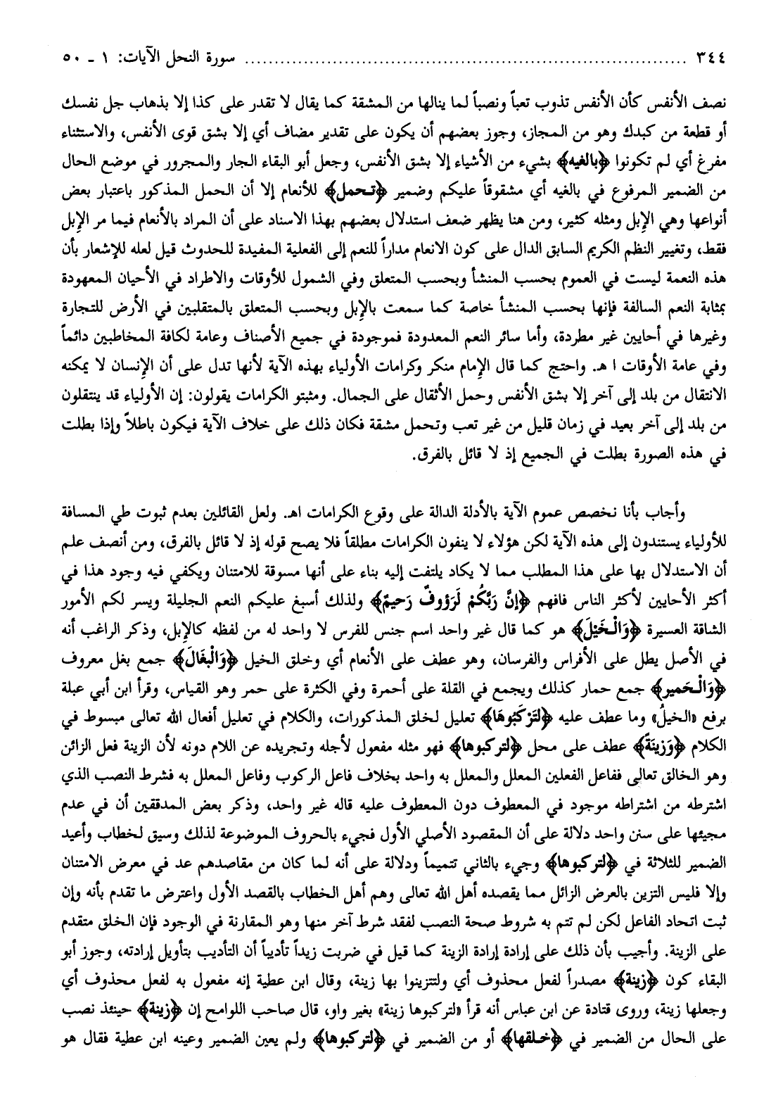 نصف الأنفس كأن الأنفس تذوب تعبا ونصبا لما ينالها من المشقة كما يقال لا تقدر على كذا إلا بذهاب جل نفسك أو قطعة من كبدك وهو من المجاز، وجوز بعضهم أن يكون على تقدير مضاف أي إلا بشق قوى الأنفس، والاستثناء مفرغ أي لم تكونوا بالِغِيهِ بشيء من الأشياء إلا بشق الأنفس، وجعل أبو البقاء الجار والمجرور في موضع الحال من الضمير المرفوع في بالغيه أي مشقوقا عليكم وضمير تَحْمِلُ للأنعام إلا أن الحمل المذكور باعتبار بعض أنواعها وهي الإبل ومثله كثير، ومن هنا يظهر ضعف استدلال بعضهم بهذا الاسناد على أن المراد بالأنعام فيما مر الإبل فقط، وتغيير النظم الكريم السابق الدال على كون الانعام مدارا للنعم إلى الفعلية المفيدة للحدوث قيل لعله للإشعار بأن هذه النعمة ليست في العموم بحسب المنشأ وبحسب المتعلق وفي الشمول للأوقات والاطراد في الأحيان المعهودة بمثابة النعم السالفة فإنها بحسب المنشأ خاصة كما سمعت بالإبل وبحسب المتعلق بالمتقلبين في الأرض للتجارة وغيرها في أحايين غير مطردة، وأما سائر النعم المعدودة فموجودة في جميع الأصناف وعامة لكافة المخاطبين دائما وفي عامة الأوقات اه. واحتج كما قال الإمام منكر وكرامات الأولياء بهذه الآية لأنها تدل على أن الإنسان لا يمكنه الانتقال من بلد إلى آخر إلا بشق الأنفس وحمل الأثقال على الجمال. ومثبتو الكرامات يقولون: إن الأولياء قد ينتقلون من بلد إلى آخر بعيد في زمان قليل من غير تعب وتحمل مشقة فكان ذلك على خلاف الآية فيكون باطلا وإذا بطلت في هذه الصورة بطلت في الجميع إذ لا قائل بالفرق.