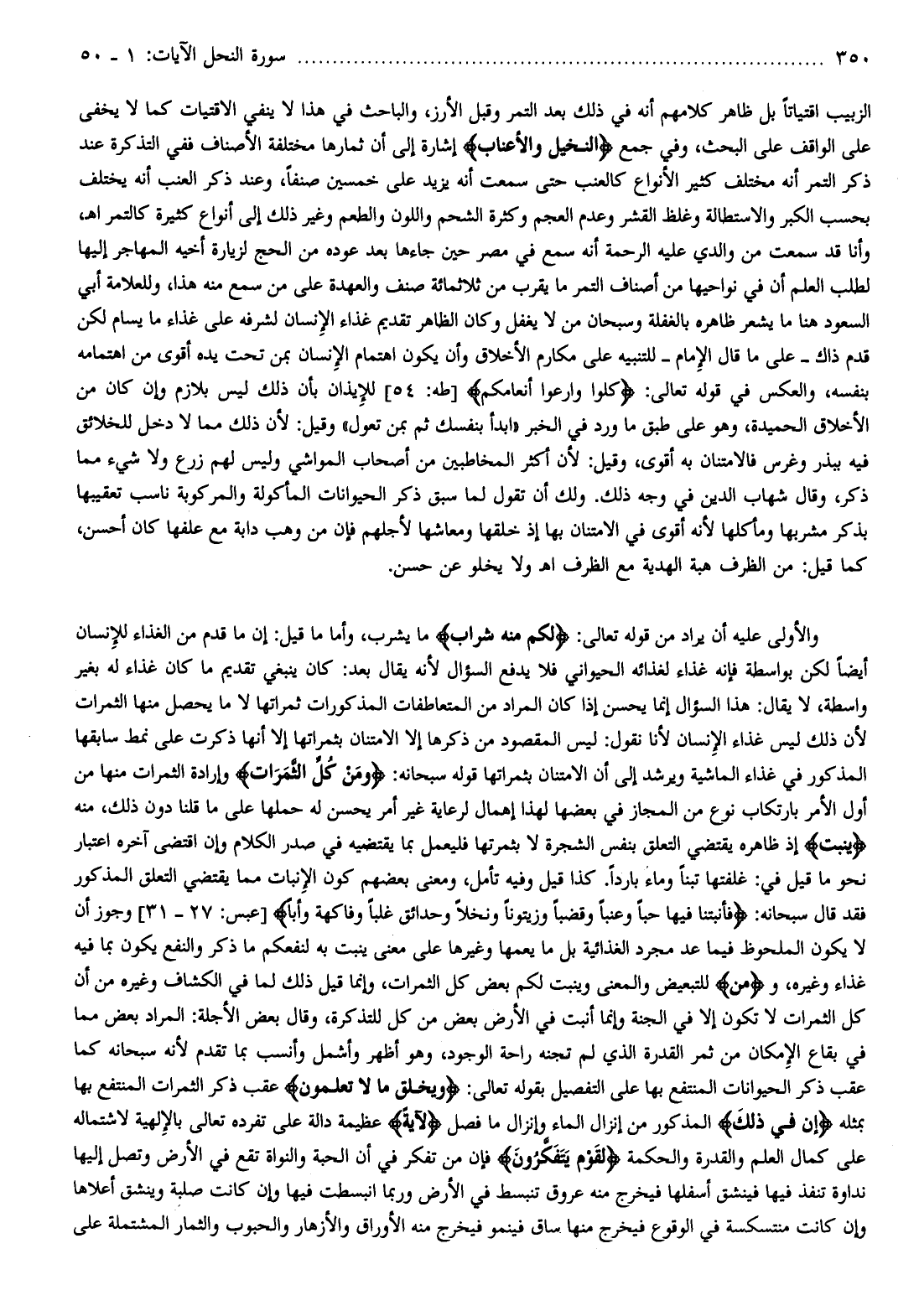 والأولى عليه أن يراد من قوله تعالى: لَكُمْ مِنْهُ شَرابٌ ما يشرب، وأما ما قيل: إن ما قدم من الغذاء للإنسان أيضا لكن بواسطة فإنه غذاء لغذائه الحيواني فلا يدفع السؤال لأنه يقال بعد: كان ينبغي تقديم ما كان غذاء له بغير واسطة، لا يقال: هذا السؤال إنما يحسن إذا كان المراد من المتعاطفات المذكورات ثمراتها لا ما يحصل منها الثمرات لأن ذلك ليس غذاء الإنسان لأنا نقول: ليس المقصود من ذكرها إلا الامتنان بثمراتها إلا أنها ذكرت على نمط سابقها المذكور في غذاء الماشية ويرشد إلى أن الامتنان بثمراتها قوله سبحانه: وَمِنْ كُلِّ الثَّمَراتِ وإرادة الثمرات منها من أول الأمر بارتكاب نوع من المجاز في بعضها لهذا إهمال لرعاية غير أمر يحسن له حملها على ما قلنا دون ذلك، منه يُنْبِتُ إذ ظاهره يقتضي التعلق بنفس الشجرة لا بثمرتها فليعمل بما يقتضيه في صدر الكلام وإن اقتضى آخره اعتبار نحو ما قيل في: غلفتها تبنا وماء باردا. كذا قيل وفيه تأمل، ومعنى بعضهم كون الإنبات مما يقتضي التعلق المذكور فقد قال سبحانه: فَأَنْبَتْنا فِيها حَبًّا وَعِنَباً وَقَضْباً وَزَيْتُوناً وَنَخْلًا وَحَدائِقَ غُلْباً وَفاكِهَةً وَأَبًّا [عبس: 27- 31] وجوز أن لا يكون الملحوظ فيما عد مجرد الغذائية بل ما يعمها وغيرها على معنى ينبت به لنفعكم ما ذكر والنفع يكون بما فيه غذاء وغيره، ومِنْ للتبعيض والمعنى وينبت لكم بعض كل الثمرات، وإنما قيل ذلك لما في الكشاف وغيره من أن كل الثمرات لا تكون إلا في الجنة وإنما أنبت في الأرض بعض من كل للتذكرة، وقال بعض الأجلة: المراد بعض مما في بقاع الإمكان من ثمر القدرة الذي لم تجنه راحة الوجود، وهو أظهر وأشمل وأنسب بما تقدم لأنه سبحانه كما عقب ذكر الحيوانات المنتفع بها على التفصيل بقوله تعالى: وَيَخْلُقُ ما لا تَعْلَمُونَ عقب ذكر الثمرات المنتفع بها بمثله إِنَّ فِي ذلِكَ المذكور من إنزال الماء وإنزال ما فصل لَآيَةً عظيمة دالة على تفرده تعالى بالإلهية لاشتماله على كمال العلم والقدرة والحكمة لِقَوْمٍ يَتَفَكَّرُونَ فإن من تفكر في أن الحبة والنواة تقع في الأرض وتصل إليها نداوة تنفذ فيها فينشق أسفلها فيخرج منه عروق تنبسط في الأرض وربما انبسطت فيها وإن كانت صلبة وينشق أعلاها وإن كانت منتسكسة في الوقوع فيخرج منها ساق فينمو فيخرج منه الأوراق والأزهار والحبوب والثمار المشتملة على