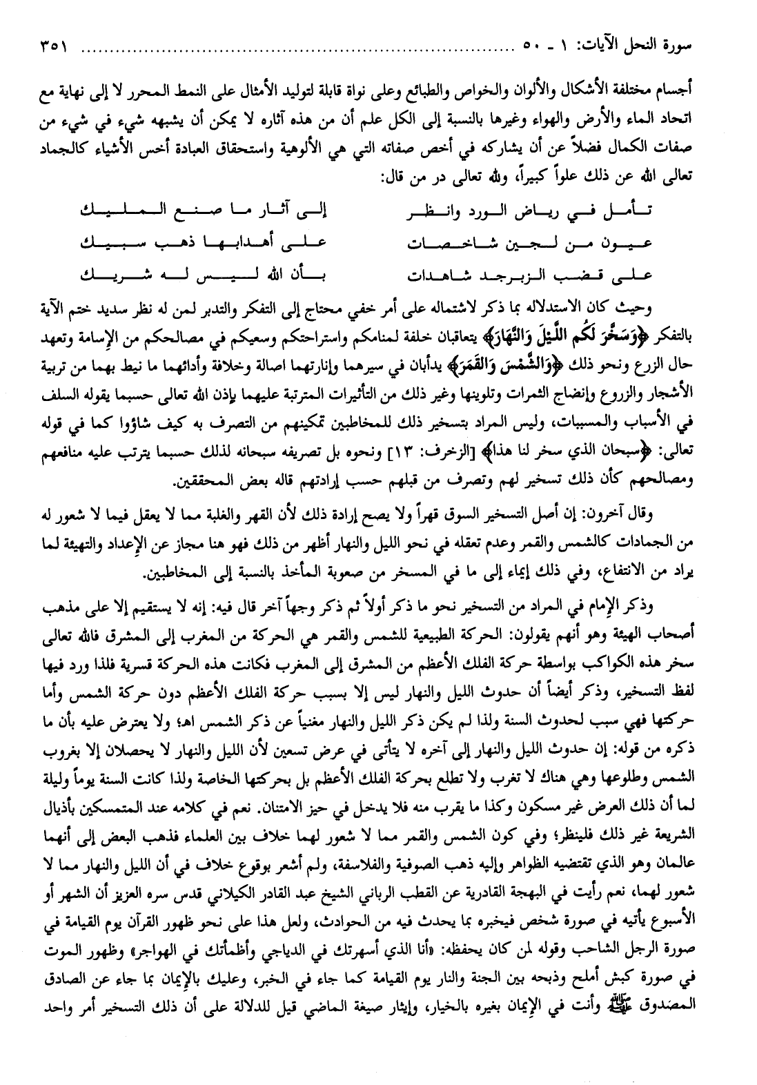 وذكر الإمام في المراد من التسخير نحو ما ذكر أولا ثم ذكر وجها آخر قال فيه: إنه لا يستقيم إلا على مذهب أصحاب الهيئة وهو أنهم يقولون: الحركة الطبيعية للشمس والقمر هي الحركة من المغرب إلى المشرق فالله تعالى سخر هذه الكواكب بواسطة حركة الفلك الأعظم من المشرق إلى المغرب فكانت هذه الحركة قسرية فلذا ورد فيها لفظ التسخير، وذكر أيضا أن حدوث الليل والنهار ليس إلا بسبب حركة الفلك الأعظم دون حركة الشمس وأما حركتها فهي سبب لحدوث السنة ولذا لم يكن ذكر الليل والنهار مغنيا عن ذكر الشمس اه ولا يعترض عليه بأن ما ذكره من قوله: إن حدوث الليل والنهار إلى آخره لا يتأتى في عرض تسعين لأن الليل والنهار لا يحصلان إلا بغروب الشمس وطلوعها وهي هناك لا تغرب ولا تطلع بحركة الفلك الأعظم بل بحركتها الخاصة ولذا كانت السنة يوما وليلة لما أن ذلك العرض غير مسكون وكذا ما يقرب منه فلا يدخل في حيز الامتنان. نعم في كلامه عند المتمسكين بأذيال الشريعة غير ذلك فلينظر وفي كون الشمس والقمر مما لا شعور لهما خلاف بين العلماء فذهب البعض إلى أنهما عالمان وهو الذي تقتضيه الظواهر وإليه ذهب الصوفية والفلاسفة، ولم أشعر بوقوع خلاف في أن الليل والنهار مما لا شعور لهما، نعم رأيت في البهجة القادرية عن القطب الرباني الشيخ عبد القادر الكيلاني قدس سره العزيز أن الشهر أو الأسبوع يأتيه في صورة شخص فيخبره بما يحدث فيه من الحوادث، ولعل هذا على نحو ظهور القرآن يوم القيامة في صورة الرجل الشاحب وقوله لمن كان يحفظه: