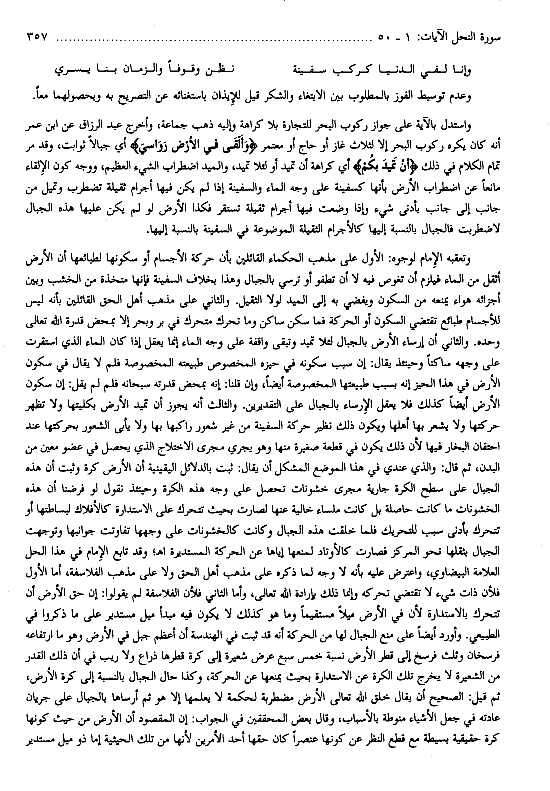 وتعقبه الإمام لوجوه: الأول على مذهب الحكماء القائلين بأن حركة الأجسام أو سكونها لطبائعها أن الأرض أثقل من الماء فيلزم أن تغوص فيه لا أن تطفو أو ترسي بالجبال وهذا بخلاف السفينة فإنها متخذة من الخشب وبين أجزائه هواء يمنعه من السكون ويفضي به إلى الميد لولا الثقيل. والثاني على مذهب أهل الحق القائلين بأنه ليس للأجسام طبائع تقتضي السكون أو الحركة فما سكن ساكن وما تحرك متحرك في بر وبحر إلا بمحض قدرة الله تعالى وحده. والثاني أن إرساء الأرض بالجبال لئلا تميد وتبقى واقفة على وجه الماء إنما يعقل إذا كان الماء الذي استقرت على وجهه ساكنا وحينئذ يقال: إن سبب سكونه في حيزه المخصوص طبيعته المخصوصة فلم لا يقال في سكون الأرض في هذا الحيز إنه بسبب طبيعتها المخصوصة أيضا، وإن قلنا: إنه بمحض قدرته سبحانه فلم لم يقل: إن سكون الأرض أيضا كذلك فلا يعقل الإرساء بالجبال على التقديرين. والثالث أنه يجوز أن تميد الأرض بكليتها ولا تظهر حركتها ولا يشعر بها أهلها ويكون ذلك نظير حركة السفينة من غير شعور راكبها بها ولا يأبى الشعور بحركتها عند احتقان البخار فيها لأن ذلك يكون في قطعة صغيرة منها وهو يجري مجرى الاختلاج الذي يحصل في عضو معين من البدن، ثم قال: والذي عندي في هذا الموضع المشكل أن يقال: ثبت بالدلائل اليقينية أن الأرض كرة وثبت أن هذه الجبال على سطح الكرة جارية مجرى خشونات تحصل على وجه هذه الكرة وحينئذ نقول لو فرضنا أن هذه الخشونات ما كانت حاصلة بل كانت ملساء خالية عنها لصارت بحيث تتحرك على الاستدارة كالأفلاك لبساطتها أو تتحرك بأدنى سبب للتحريك فلما خلقت هذه الجبال وكانت كالخشونات على وجهها تفاوتت جوانبها وتوجهت الجبال بثقلها نحو المركز فصارت كالأوتاد لمنعها إياها عن الحركة المستديرة اه وقد تابع الإمام في هذا الحل العلامة البيضاوي، واعترض عليه بأنه لا وجه لما ذكره على مذهب أهل الحق ولا على مذهب الفلاسفة، أما الأول فلأن ذات شيء لا تقتضي تحركه وإنما ذلك بإرادة الله تعالى، وأما الثاني فلأن الفلاسفة لم يقولوا: إن حق الأرض أن تتحرك بالاستدارة لأن في الأرض ميلا مستقيما وما هو كذلك لا يكون فيه مبدأ ميل مستدير على ما ذكروا في الطبيعي. وأورد أيضا على منع الجبال لها من الحركة أنه قد ثبت في الهندسة أن أعظم جبل في الأرض وهو ما ارتفاعه فرسخان وثلث فرسخ إلى قطر الأرض نسبة خمس سبع عرض شعيرة إلى كرة قطرها ذراع ولا ريب في أن ذلك القدر من الشعيرة لا يخرج تلك الكرة عن الاستدارة بحيث يمنعها عن الحركة، وكذا حال الجبال بالنسبة إلى كرة الأرض، ثم قيل: الصحيح أن يقال خلق الله تعالى الأرض مضطربة لحكمة لا يعلمها إلا هو ثم أرساها بالجبال على جريان عادته في جعل الأشياء منوطة بالأسباب، وقال بعض المحققين في الجواب: إن المقصود أن الأرض من حيث كونها كرة حقيقية بسيطة مع قطع النظر عن كونها عنصرا كان حقها أحد الأمرين لأنها من تلك الحيثية إما ذو ميل مستدير
