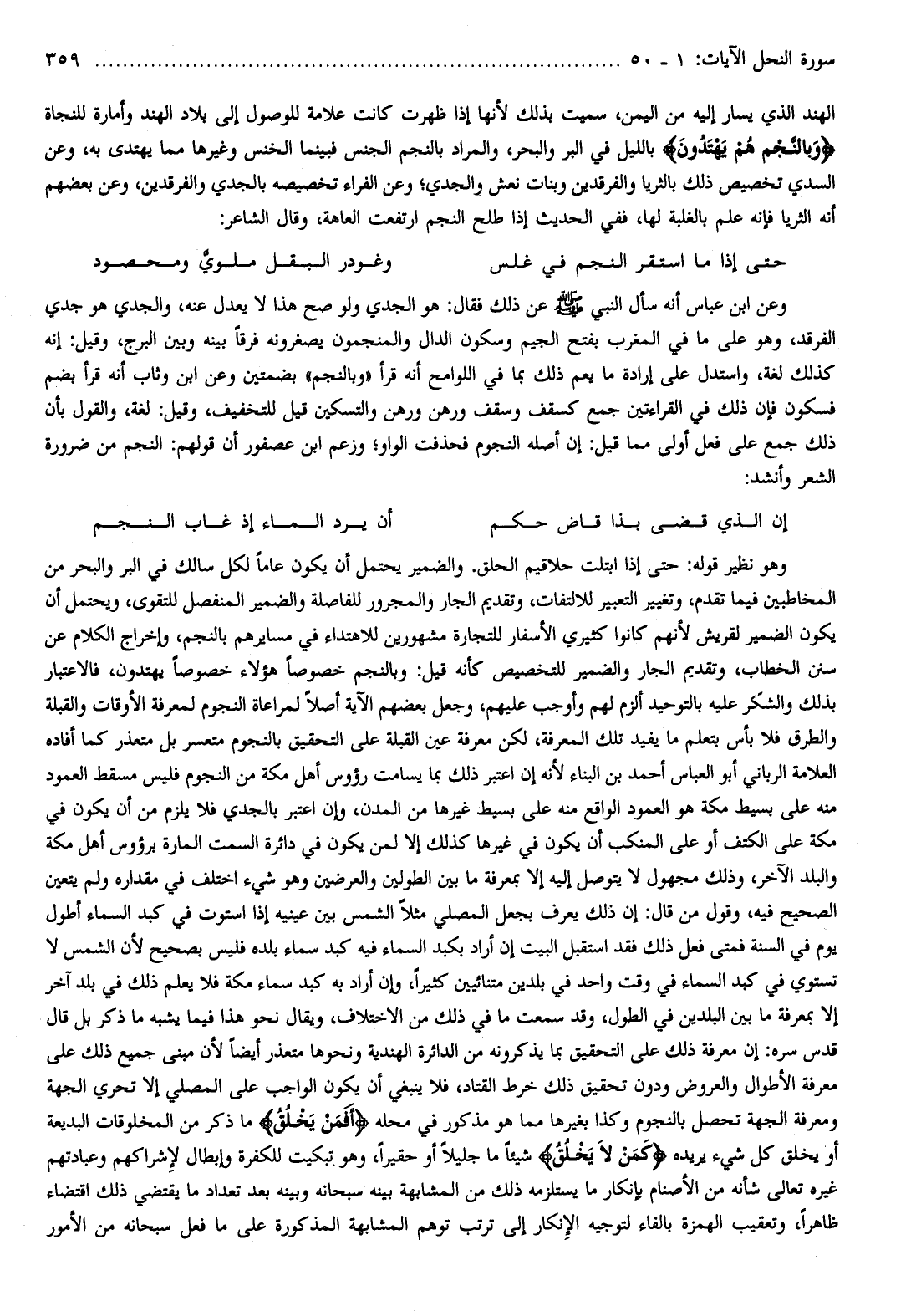 وهو نظير قوله: حتى إذا ابتلت حلاقيم الحلق. والضمير يحتمل أن يكون عاما لكل سالك في البر والبحر من المخاطبين فيما تقدم، وتغيير التعبير للالتفات، وتقديم الجار والمجرور للفاصلة والضمير المنفصل للتقوى، ويحتمل أن يكون الضمير لقريش لأنهم كانوا كثيري الأسفار للتجارة مشهورين للاهتداء في مسايرهم بالنجم، وإخراج الكلام عن سنن الخطاب، وتقديم الجار والضمير للتخصيص كأنه قيل: وبالنجم خصوصا هؤلاء خصوصا يهتدون، فالاعتبار بذلك والشكر عليه بالتوحيد ألزم لهم وأوجب عليهم، وجعل بعضهم الآية أصلا لمراعاة النجوم لمعرفة الأوقات والقبلة والطرق فلا بأس بتعلم ما يفيد تلك المعرفة، لكن معرفة عين القبلة على التحقيق بالنجوم متعسر بل متعذر كما أفاده العلامة الرباني أبو العباس أحمد بن البناء لأنه إن اعتبر ذلك بما يسامت رؤوس أهل مكة من النجوم فليس مسقط العمود منه على بسيط مكة هو العمود الواقع منه على بسيط غيرها من المدن، وإن اعتبر بالجدي فلا يلزم من أن يكون في مكة على الكتف أو على المنكب أن يكون في غيرها كذلك إلا لمن يكون في دائرة السمت المارة برؤوس أهل مكة والبلد الآخر، وذلك مجهول لا يتوصل إليه إلا بمعرفة ما بين الطولين والعرضين وهو شيء اختلف في مقداره ولم يتعين الصحيح فيه، وقول من قال: إن ذلك يعرف بجعل المصلي مثلا الشمس بين عينيه إذا استوت في كبد السماء أطول يوم في السنة فمتى فعل ذلك فقد استقبل البيت إن أراد بكبد السماء فيه كبد سماء بلده فليس بصحيح لأن الشمس لا تستوي في كبد السماء في وقت واحد في بلدين متنائيين كثيرا، وإن أراد به كبد سماء مكة فلا يعلم ذلك في بلد آخر إلا بمعرفة ما بين البلدين في الطول، وقد سمعت ما في ذلك من الاختلاف، ويقال نحو هذا فيما يشبه ما ذكر بل قال قدس سره: إن معرفة ذلك على التحقيق بما يذكرونه من الدائرة الهندية ونحوها متعذر أيضا لأن مبنى جميع ذلك على معرفة الأطوال والعروض ودون تحقيق ذلك خرط القتاد، فلا ينبغي أن يكون الواجب على المصلي إلا تحري الجهة ومعرفة الجهة تحصل بالنجوم وكذا بغيرها مما هو مذكور في محله أَفَمَنْ يَخْلُقُ ما ذكر من المخلوقات البديعة أو يخلق كل شيء يريده كَمَنْ لا يَخْلُقُ شيئا ما جليلا أو حقيرا، وهو تبكيت للكفرة وإبطال لإشراكهم وعبادتهم غيره تعالى شأنه من الأصنام بإنكار ما يستلزمه ذلك من المشابهة بينه سبحانه وبينه بعد تعداد ما يقتضي ذلك اقتضاء ظاهرا، وتعقيب الهمزة بالفاء لتوجيه الإنكار إلى ترتب توهم المشابهة المذكورة على ما فعل سبحانه من الأمور