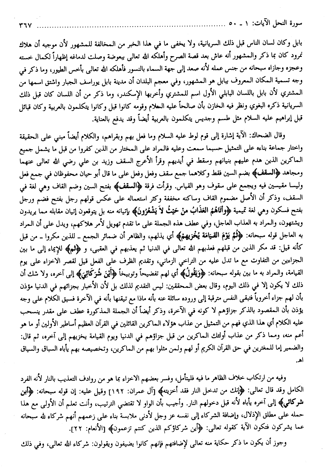 بابل وكان لسان الناس قبل ذلك السريانية، ولا يخفى ما في هذا الخبر من المخالفة للمشهور لأن موجبه أن هلاك نمرود كان بما ذكر والمشهور أنه عاش بعد قصة الصرح وأهلكه الله تعالى ببعوضة وصلت لدماغه إظهارا لكمال خسته وعجزه وجازاه سبحانه من جنس عمله لأنه صعد إلى جهة السماء بالنسور فأهلكه الله تعالى بأخس الطيور، وما ذكر في وجه تسمية المكان المعروف ببابل هو المشهور، وفي معجم البلدان أن مدينة بابل يوراسف الجبار واشتق اسمها من المشتري لأن بابل باللسان البابلي الأول اسم للمشتري وأخربها الإسكندر، وما ذكر من أن اللسان كان قبل ذلك السريانية ذكره البغوي ونظر فيه الخازن بأن صالحا عليه السلام وقومه كانوا قبل وكانوا يتكلمون بالعربية وكان قبائل قبل إبراهيم عليه السلام مثل طسم وجديس يتكلمون بالعربية أيضا وقد يدفع بالعناية.