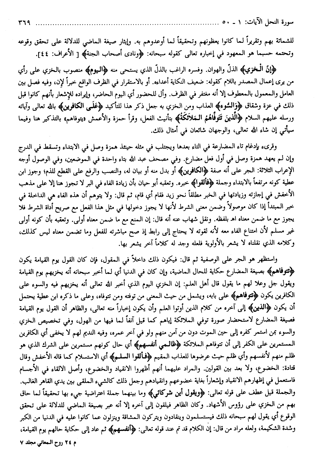 واستظهر هو الجر على الوصفية ثم قال: فيكون ذلك داخلا في المقول، فإن كان القول يوم القيامة يكون تَتَوَفَّاهُمُ بصيغة المضارع حكاية للحال الماضية، وإن كان في الدنيا أي لما أخبر سبحانه أنه يخزيهم يوم القيامة ويقول جل وعلا لهم ما يقول قال أهل العلم: إن الخزي اليوم الذي أخبر الله تعالى أنه يخزيهم فيه والسوء على الكافرين يكون تَتَوَفَّاهُمُ على بابه، ويشمل من حيث المعنى من توفته ومن تتوفاه، وعلى ما ذكره ابن عطية يحتمل أن يكون الَّذِينَ إلى آخره من كلام الذين أوتوا العلم وأن يكون إخبارا منه تعالى، والظاهر أن القول يوم القيامة فصيغة المضارع لاستحضار صورة توفي الملائكة إياهم كما قيل آنفا لما فيها من الهول، وفي تخصيص الخزي والسوء بمن استمر كفره إلى حين الموت دون من آمن منهم ولو في آخر عمره، وفيه النديم لهم لا يخفى أي الكافرين المستمرين على الكفر إلى أن تتوفاهم الملائكة ظالِمِي أَنْفُسِهِمْ أي حال كونهم مستمرين على الشرك الذي هو ظلم منهم لأنفسهم وأي ظلم حيث عرضوها للعذاب المقيم فَأَلْقَوُا السَّلَمَ أي الاستسلام كما قاله الأخفش وقال قتادة: الخضوع، ولا بعد بين القولين. والمراد عليهما أنهم أظهروا الانقياد والخضوع، وأصل الإلقاء في الأجسام فاستعمل في إظهارهم الانقياد وإشعارا بغاية خضوعهم وانقيادهم وجعل ذلك كالشيء الملقى بين يدي القاهر الغالب.