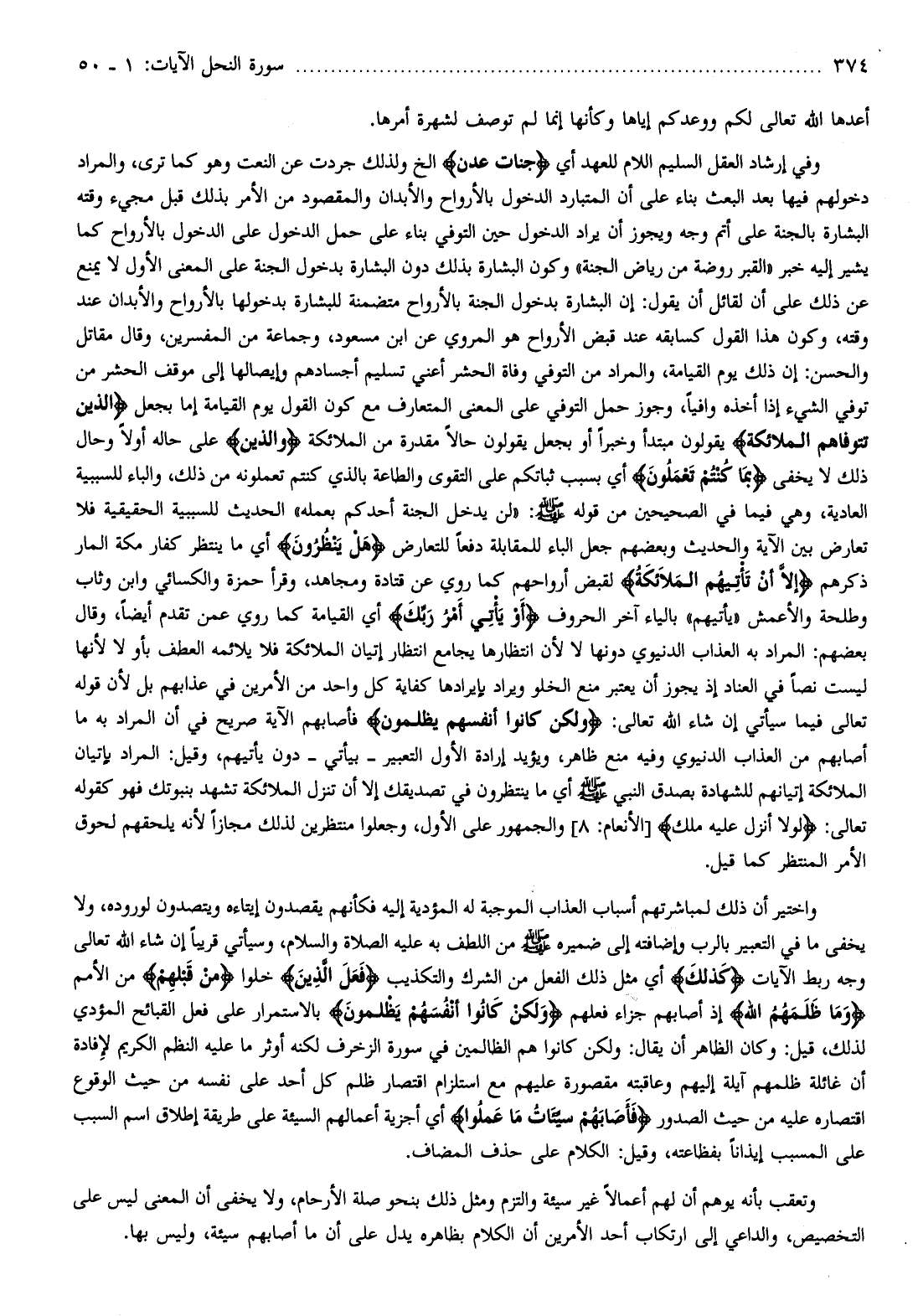 وكون البشارة بذلك دون البشارة بدخول الجنة على المعنى الأول لا يمنع عن ذلك على أن لقائل أن يقول: إن البشارة بدخول الجنة بالأرواح متضمنة للبشارة بدخولها بالأرواح والأبدان عند وقته، وكون هذا القول كسابقه عند قبض الأرواح هو المروي عن ابن مسعود، وجماعة من المفسرين، وقال مقاتل والحسن: إن ذلك يوم القيامة، والمراد من التوفي وفاة الحشر أعني تسليم أجسادهم وإيصالها إلى موقف الحشر من توفي الشيء إذا أخذه وافيا، وجوز حمل التوفي على المعنى المتعارف مع كون القول يوم القيامة إما بجعل الَّذِينَ تَتَوَفَّاهُمُ الْمَلائِكَةُ يقولون مبتدأ وخبرا أو بجعل يقولون حالا مقدرة من الملائكة والَّذِينَ على حاله أولا وحال ذلك لا يخفى بِما كُنْتُمْ تَعْمَلُونَ أي بسبب ثباتكم على التقوى والطاعة بالذي كنتم تعملونه من ذلك، والباء للسببية العادية، وهي فيما