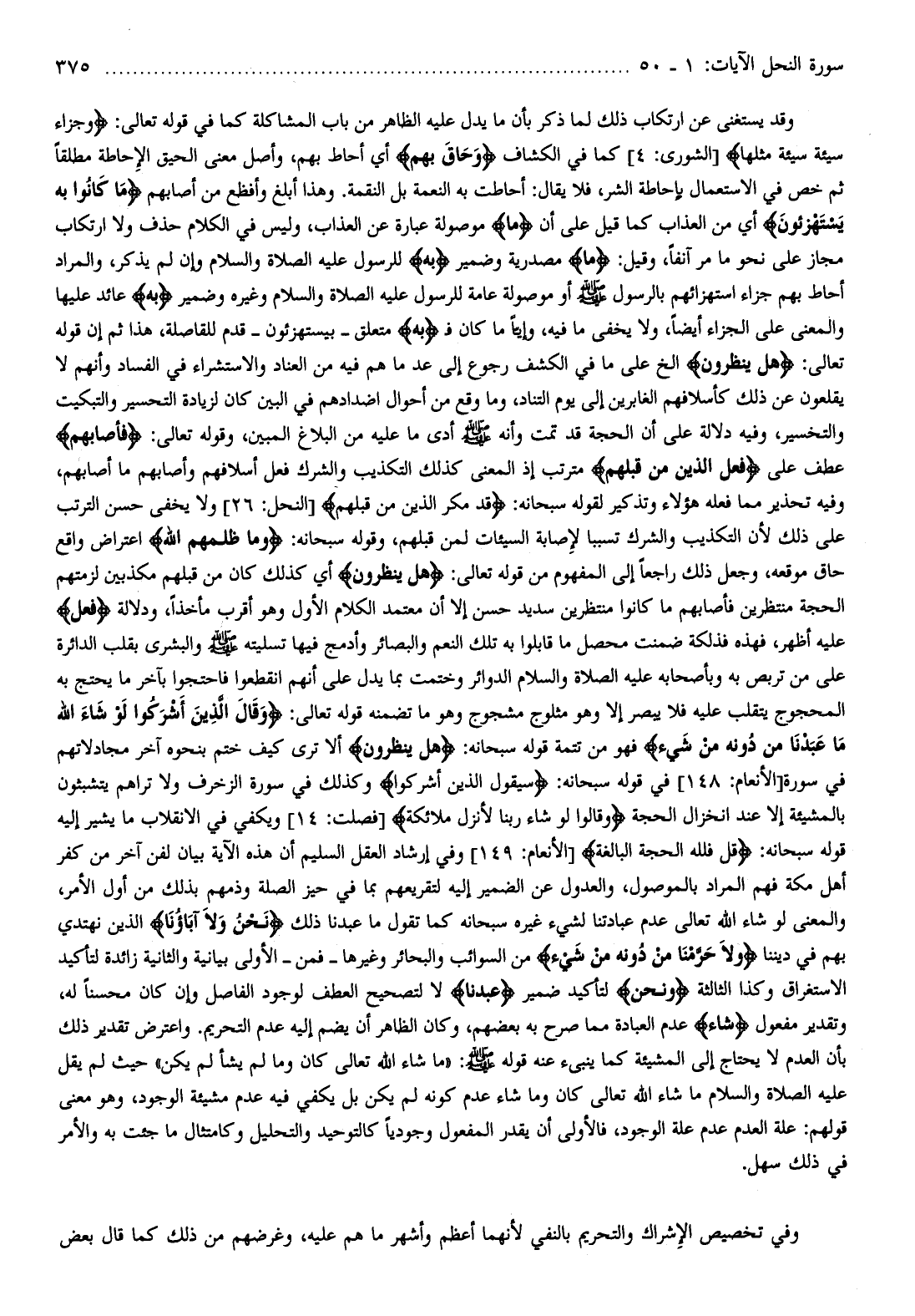 عليه أظهر، فهذه فذلكة ضمنت محصل ما قابلوا به تلك النعم والبصائر وأدمج فيها تسليته صلى الله عليه وسلم والبشرى بقلب الدائرة على من تربص به وبأصحابه عليه الصلاة والسلام الدوائر وختمت بما يدل على أنهم انقطعوا فاحتجوا بآخر ما يحتج به المحجوج يتقلب عليه فلا يبصر إلا وهو مثلوج مشجوج وهو ما تضمنه قوله تعالى: وَقالَ الَّذِينَ أَشْرَكُوا لَوْ شاءَ اللَّهُ ما عَبَدْنا مِنْ دُونِهِ مِنْ شَيْءٍ فهو من تتمة قوله سبحانه: لْ يَنْظُرُونَ