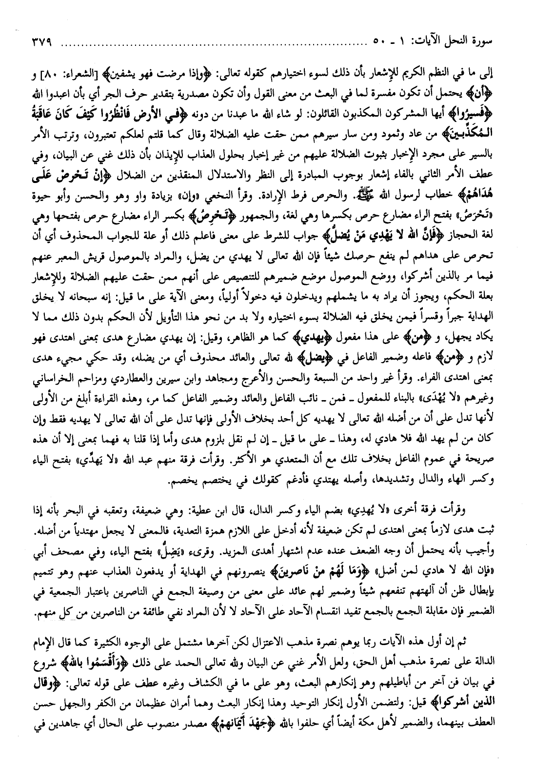 إلى ما في النظم الكريم للإشعار بأن ذلك لسوء اختيارهم كقوله تعالى: وَإِذا مَرِضْتُ فَهُوَ يَشْفِينِ [الشعراء: 80] وأَنِ يحتمل أن تكون مفسرة لما في البعث من معنى القول وأن تكون مصدرية بتقدير حرف الجر أي بأن اعبدوا الله فَسِيرُوا أيها المشركون المكذبون القائلون: لو شاء الله ما عبدنا من دونه فِي الْأَرْضِ فَانْظُرُوا كَيْفَ كانَ عاقِبَةُ الْمُكَذِّبِينَ من عاد وثمود ومن سار سيرهم ممن حقت عليه الضلالة وقال كما قلتم لعلكم تعتبرون، وترتب الأمر بالسير على مجرد الإخبار بثبوت الضلالة عليهم من غير إخبار بحلول العذاب للإيذان بأن ذلك غني عن البيان، وفي عطف الأمر الثاني بالفاء إشعار بوجوب المبادرة إلى النظر والاستدلال المنقذين من الضلال إِنْ تَحْرِصْ عَلى هُداهُمْ خطاب لرسول الله صلى الله عليه وسلم. والحرص فرط الإرادة. وقرأ النخعي «وإن» بزيادة واو وهو والحسن وأبو حيوة «تحرص» بفتح الراء مضارع حرص بكسرها وهي لغة، والجمهور تَحْرِصْ بكسر الراء مضارع حرص بفتحها وهي لغة الحجاز فَإِنَّ اللَّهَ لا يَهْدِي مَنْ يُضِلُّ جواب للشرط على معنى فاعلم ذلك أو علة للجواب المحذوف أي أن تحرص على هداهم لم ينفع حرصك شيئا فإن الله تعالى لا يهدي من يضل، والمراد بالموصول قريش المعبر عنهم فيما مر بالذين أشركوا، ووضع الموصول موضع ضميرهم للتنصيص على أنهم ممن حقت عليهم الضلالة وللإشعار بعلة الحكم، ويجوز أن يراد به ما يشملهم ويدخلون فيه دخولا أوليا، ومعنى الآية على ما قيل: إنه سبحانه لا يخلق الهداية جبرا وقسرا فيمن يخلق فيه الضلالة بسوء اختياره ولا بد من نحو هذا التأويل لأن الحكم بدون ذلك مما لا يكاد يجهل، ومَنْ على هذا مفعول يَهْدِي كما هو الظاهر، وقيل: إن يهدي مضارع هدى بمعنى اهتدى فهو لازم ومَنْ فاعله وضمير الفاعل في يُضِلُّ لله تعالى والعائد محذوف أي من يضله، وقد حكي مجيء هدى بمعنى اهتدى الفراء. وقرأ غير واحد من السبعة والحسن والأعرج ومجاهد وابن سيرين والعطاردي ومزاحم الخراساني وغيرهم «لا يهدى» بالبناء للمفعول- فمن- نائب الفاعل والعائد وضمير الفاعل كما مر، وهذه القراءة أبلغ من الأولى لأنها تدل على أن من أضله الله تعالى لا يهديه كل أحد بخلاف الأولى فإنها تدل على أن الله تعالى لا يهديه فقط وإن كان من لم يهد الله فلا هادي له، وهذا- على ما قيل- إن لم نقل بلزوم هدى وأما إذا قلنا به فهما بمعنى إلا أن هذه صريحة في عموم الفاعل بخلاف تلك مع أن المتعدي هو الأكثر. وقرأت فرقة منهم عبد الله «لا يهدّي» بفتح الياء وكسر الهاء والدال وتشديدها، وأصله يهتدي فأدغم كقولك في يختصم يخصم.