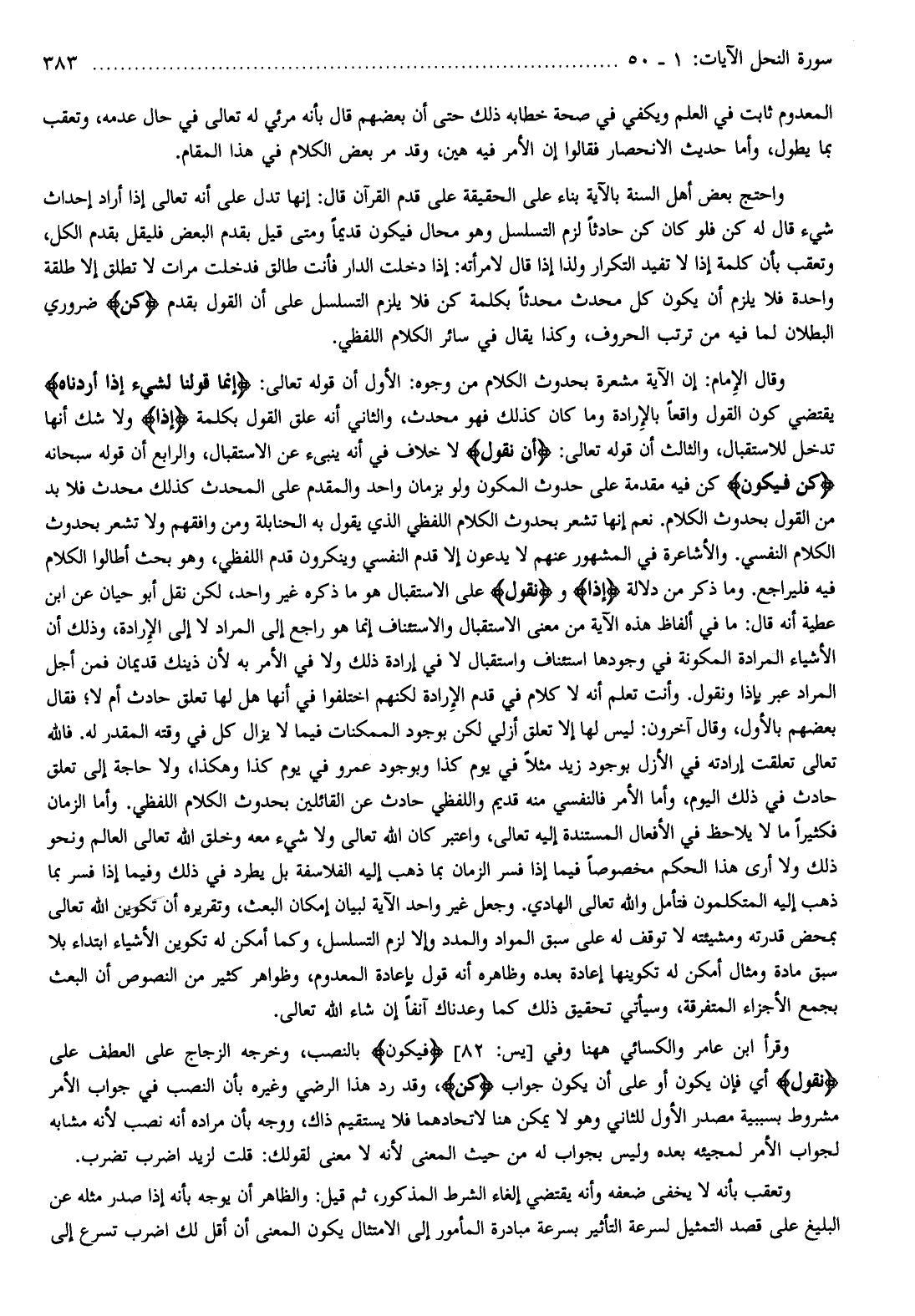 وقال الإمام: إن الآية مشعرة بحدوث الكلام من وجوه: الأول أن قوله تعالى: إِنَّما قَوْلُنا لِشَيْءٍ إِذا أَرَدْناهُ يقتضي كون القول واقعا بالإرادة وما كان كذلك فهو محدث، والثاني أنه علق القول بكلمة إِذا ولا شك أنها تدخل للاستقبال، والثالث أن قوله تعالى: أَنْ نَقُولَ لا خلاف في أنه ينبئ عن الاستقبال، والرابع أن قوله سبحانه كُنْ فَيَكُونُ كن فيه مقدمة على حدوث المكون ولو بزمان واحد والمقدم على المحدث كذلك محدث فلا بد من القول بحدوث الكلام. نعم إنها تشعر بحدوث الكلام اللفظي الذي يقول به الحنابلة ومن وافقهم ولا تشعر بحدوث الكلام النفسي. والأشاعرة في المشهور عنهم لا يدعون إلا قدم النفسي وينكرون قدم اللفظي، وهو بحث أطالوا الكلام فيه فليراجع. وما ذكر من دلالة إِذا ونَقُولَ على الاستقبال هو ما ذكره غير واحد، لكن نقل أبو حيان عن ابن عطية أنه قال: ما في ألفاظ هذه الآية من معنى الاستقبال والاستئناف إنما هو راجع إلى المراد لا إلى الإرادة، وذلك أن الأشياء المرادة المكونة في وجودها استئناف واستقبال لا في إرادة ذلك ولا في الأمر به لأن ذينك قديمان فمن أجل المراد عبر بإذا ونقول. وأنت تعلم أنه لا كلام في قدم الإرادة لكنهم اختلفوا في أنها هل لها تعلق حادث أم لا فقال بعضهم بالأول، وقال آخرون: ليس لها إلا تعلق أزلي لكن بوجود الممكنات فيما لا يزال كل في وقته المقدر له. فالله تعالى تعلقت إرادته في الأزل بوجود زيد مثلا في يوم كذا وبوجود عمرو في يوم كذا وهكذا، ولا حاجة إلى تعلق حادث في ذلك اليوم، وأما الأمر فالنفسي منه قديم واللفظي حادث عن القائلين بحدوث الكلام اللفظي. وأما الزمان فكثيرا ما لا يلاحظ في الأفعال المستندة إليه تعالى، واعتبر كان الله تعالى ولا شيء معه وخلق الله تعالى العالم ونحو ذلك ولا أرى هذا الحكم مخصوصا فيما إذا فسر الزمان بما ذهب إليه الفلاسفة بل يطرد في ذلك وفيما إذا فسر بما ذهب إليه المتكلمون فتأمل والله تعالى الهادي. وجعل غير واحد الآية لبيان إمكان البعث، وتقريره أن تكوين الله تعالى بمحض قدرته ومشيئته لا توقف له على سبق المواد والمدد وإلا لزم التسلسل، وكما أمكن له تكوين الأشياء ابتداء بلا سبق مادة ومثال أمكن له تكوينها إعادة بعده وظاهره أنه قول بإعادة المعدوم، وظواهر كثير من النصوص أن البعث بجمع الأجزاء المتفرقة، وسيأتي تحقيق ذلك كما وعدناك آنفا إن شاء الله تعالى.