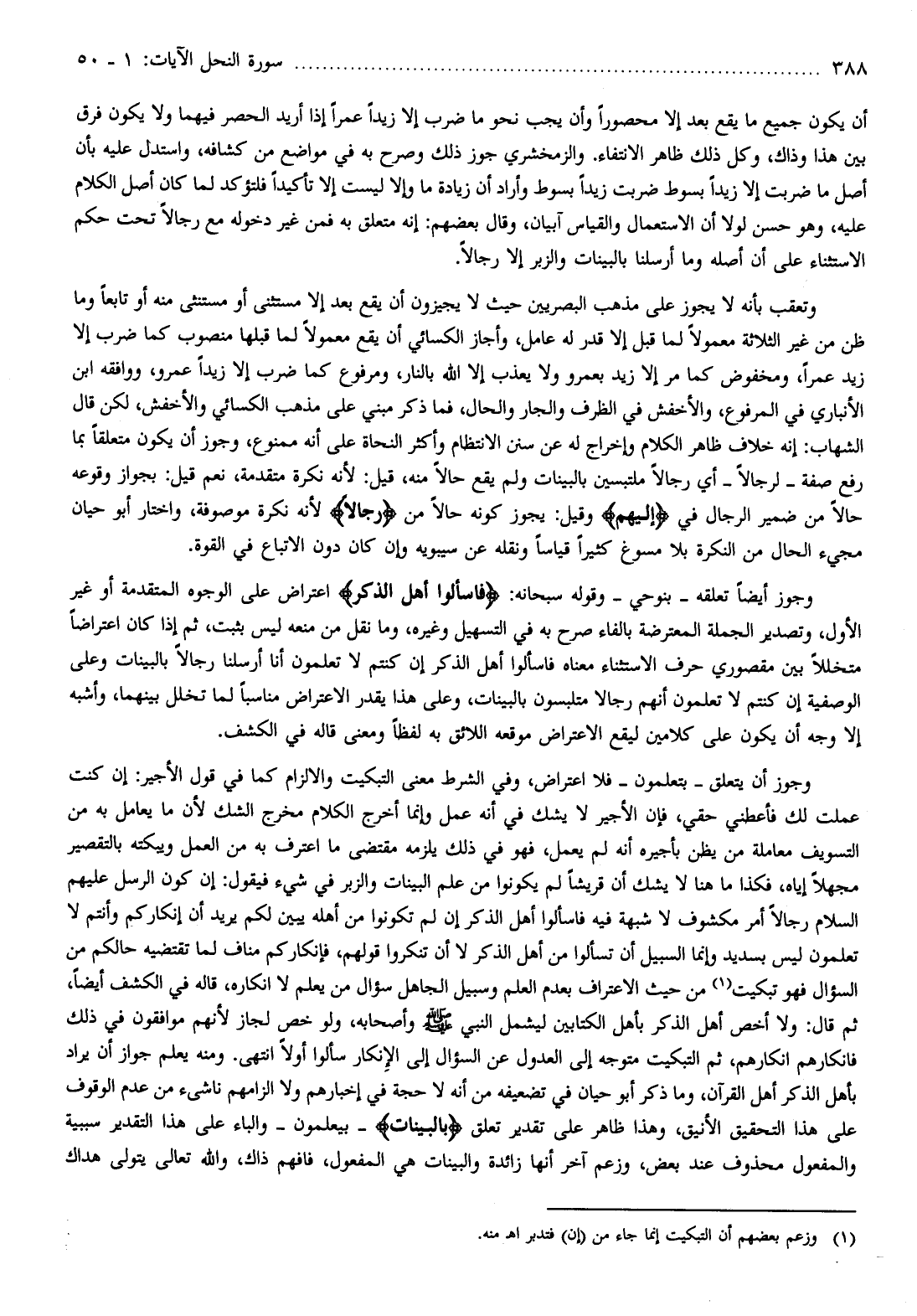 وجوز أيضا تعلقه- بنوحي- وقوله سبحانه: فَسْئَلُوا أَهْلَ الذِّكْرِ اعتراض على الوجوه المتقدمة أو غير الأول، وتصدير الجملة المعترضة بالفاء صرح به في التسهيل وغيره، وما نقل من منعه ليس بثبت، ثم إذا كان اعتراضا متخللا بين مقصوري حرف الاستثناء معناه فاسألوا أهل الذكر إن كنتم لا تعلمون أنا أرسلنا رجالا بالبينات وعلى الوصفية إن كنتم لا تعلمون أنهم رجالا متلبسون بالبينات، وعلى هذا يقدر الاعتراض مناسبا لما تخلل بينهما، وأشبه إلا وجه أن يكون على كلامين ليقع الاعتراض موقعه اللائق به لفظا ومعنى قاله في الكشف.