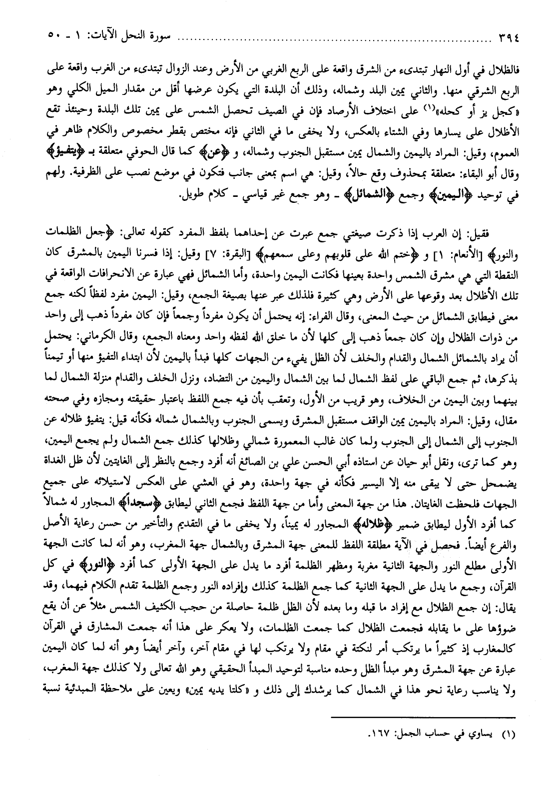 فالظلال في أول النهار تبتدئ من الشرق واقعة على الربع الغربي من الأرض وعند الزوال تبتدئ من الغرب واقعة على الربع الشرقي منها. والثاني يمين البلد وشماله، وذلك أن البلدة التي يكون عرضها أقل من مقدار الميل الكلي وهو «كجل يز أو كحله» (¬1) على اختلاف الأرصاد فإن في الصيف تحصل الشمس على يمين تلك البلدة وحينئذ تقع الأظلال على يسارها وفي الشتاء بالعكس، ولا يخفى ما في الثاني فإنه مختص بقطر مخصوص والكلام ظاهر في العموم، وقيل: المراد باليمين والشمال يمين مستقبل الجنوب وشماله، وعَنِ كما قال الحوفي متعلقة ب يَتَفَيَّؤُا وقال أبو البقاء: متعلقة بمحذوف وقع حالا، وقيل: هي اسم بمعنى جانب فتكون في موضع نصب على الظرفية. ولهم في توحيد الْيَمِينِ وجمع الشَّمائِلِ- وهو جمع غير قياسي- كلام طويل.
