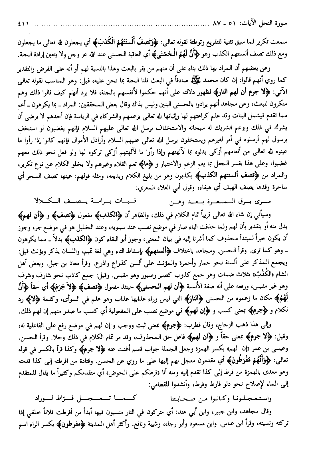 ويجمع المذكر على ألسنة نحو حمار وأحمرة والمؤنث على ألسن كذراع واذرع. وقرأ معاذ بن جبل. وبعض أهل الشام «الكذب» بثلاث ضمات وهو جمع كذوب كصبر وصبور وهو مقيس. وقيل: جمع كاذب نحو شارف وشرف وهو غير مقيس، ورفعه على أنه صفة الألسنة أَنَّ لَهُمُ الْحُسْنى حينئذ مفعول تَصِفُ لا جَرَمَ أي حقا أَنَّ لَهُمُ
