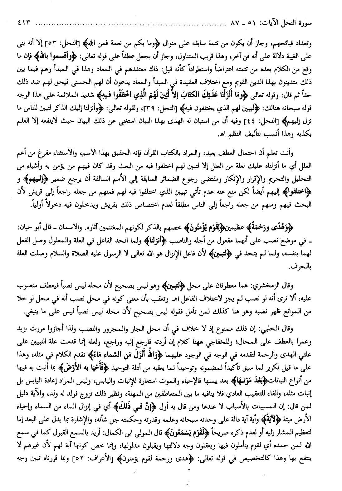 وتعداد قبائحهم، وجاز أن يكون من تتمة سابقه على منوال وَما بِكُمْ مِنْ نِعْمَةٍ فَمِنَ اللَّهِ [النحل: 53] إلا أنه بنى على الغيبة دلالة على أنه فن آخر، وهذا قريب المتناول، وجاز أن يجعل عطفا على قوله تعالى: وَأَقْسَمُوا بِاللَّهِ فإن ما وقع من الكلام بعده من تتمته اعتراضا واستطرادا كأنه قيل: ذاك معتقدهم في المعاد وهذا في المبتدأ وهم فيما بين ذلك متدينون بهذا الدين القويم ومع اختلاف العقيدة في المبدأ والمعاد يدعون أن لهم الحسنى فيحق لهم ضد ذلك حقا ثم قال: وقوله تعالى وَما أَنْزَلْنا عَلَيْكَ الْكِتابَ إِلَّا لِتُبَيِّنَ لَهُمُ الَّذِي اخْتَلَفُوا فِيهِ شديد الملائمة على هذا الوجه قوله سبحانه هنالك: لِيُبَيِّنَ لَهُمُ الَّذِي يَخْتَلِفُونَ فِيهِ [النحل: 39] ، ولقوله تعالى: وَأَنْزَلْنا إِلَيْكَ الذِّكْرَ لِتُبَيِّنَ لِلنَّاسِ ما نُزِّلَ إِلَيْهِمْ [النحل: 44] وفيه أن من استبان له الهدى بهذا البيان استغنى عن ذلك البيان حيث لا ينفعه إلا العلم بكذبه وهذا أنسب لتأليف النظم اه.