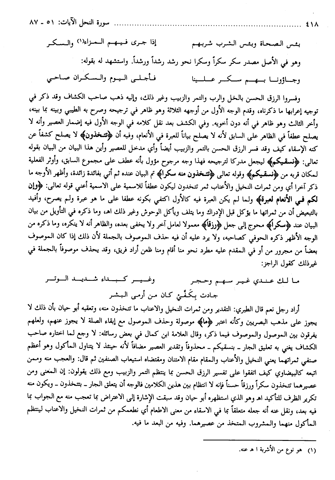 جادت بكفّي كان من أرمى البشر أراد رجل نعم قال الطبري: التقدير ومن ثمرات النخيل والأعناب ما تتخذون منه، وتعقبه أبو حيان بأن ذلك لا يجوز على مذهب البصريين وكأنه اعتبر ما موصولة وحذف الموصول مع إبقاء الصلة لا يجوز عنهم، ولعلهم يفرقون بين الموصول والموصوف فيما ذكر، وقال العلامة ابن كمال في بعض رسائله: لا وجع لما اختاره صاحب الكشاف يغني به تعليق الجار- بنسقيكم- محذوفا وتقدير العصير مضافا لأنه حينئذ لا يتناول المأكول وهو أعظم صنفي ثمراتهما يعني النخيل والأعناب والمقام مقام الامتنان ومقتضاه استيعاب الصنفين ثم قال: والعجب منه وممن اتبعه كالبيضاوي كيف اتفقوا على تفسير الرزق الحسن بما ينتظم التمر والزبيب ومع ذلك يقولون: إن المعنى ومن عصيرهما تتخذون سكرا ورزقا حسنا فإنه لا انتظام بين هذين الكلامين فالوجه أن يتعلق الجار- بتتخذون- ويكون منه تكرير الظرف للتأكيد اه وهو الذي استظهره أبو حيان وقد سبقت الإشارة إلى الاعتراض بما تعجب منه مع الجواب بما فيه بعد، ونقل عنه أنه جعله متعلقا بما في الاسقاء من معنى الإطعام أي نطعمكم من ثمرات النخيل والأعناب لينتظم المأكول منهما والمشروب المتخذ من عصيرهما. وفيه من البعد ما فيه.