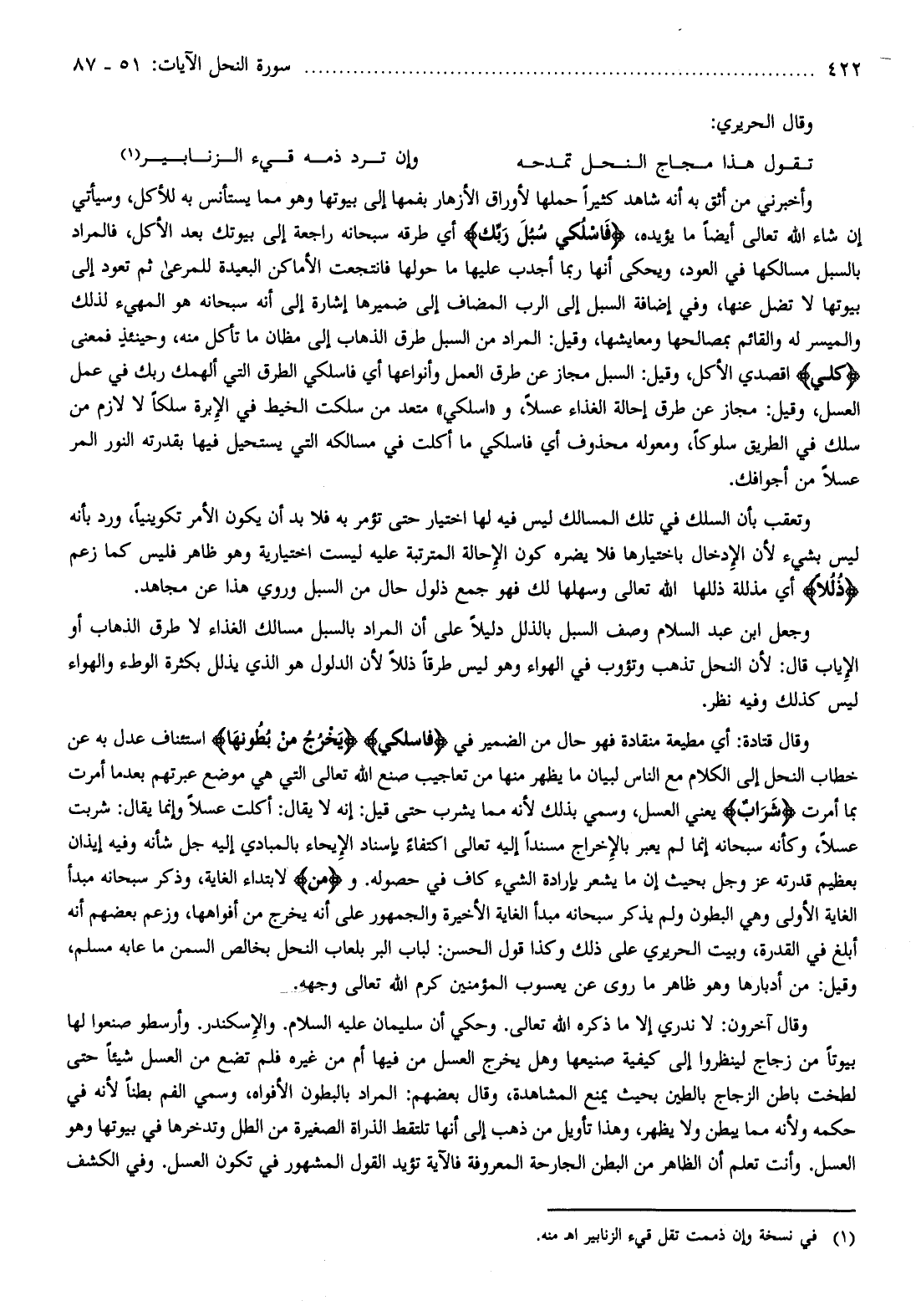 وقال قتادة: أي مطيعة منقادة فهو حال من الضمير في فَاسْلُكِي يَخْرُجُ مِنْ بُطُونِها استئناف عدل به عن خطاب النحل إلى الكلام مع الناس لبيان ما يظهر منها من تعاجيب صنع الله تعالى التي هي موضع عبرتهم بعد ما أمرت بما أمرت شَرابٌ يعني العسل، وسمي بذلك لأنه مما يشرب حتى قيل: إنه لا يقال: أكلت عسلا وإنما يقال: شربت عسلا، وكأنه سبحانه إنما لم يعبر بالإخراج مسندا إليه تعالى اكتفاء بإسناد الإيحاء بالمبادي إليه جل شأنه وفيه إيذان بعظيم قدرته عز وجل بحيث إن ما يشعر بإرادة الشيء كاف في حصوله. ومِنْ لابتداء الغاية، وذكر سبحانه مبدأ الغاية الأولى وهي البطون ولم يذكر سبحانه مبدأ الغاية الأخيرة والجمهور على أنه يخرج من أفواهها، وزعم بعضهم أنه أبلغ في القدرة، وبيت الحريري على ذلك وكذا قول الحسن: لباب البر بلعاب النحل بخالص السمن ما عابه مسلم، وقيل: من أدبارها وهو ظاهر ما روى عن يعسوب المؤمنين كرم الله تعالى وجهه.