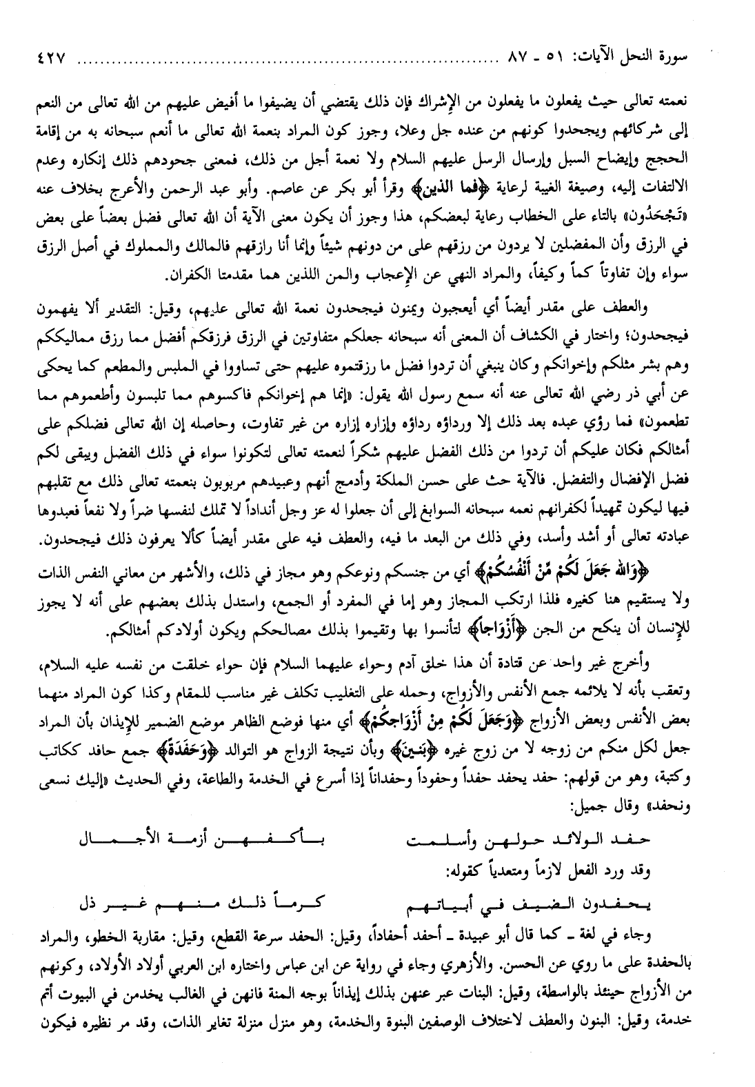 وأخرج غير واحد عن قتادة أن هذا خلق آدم وحواء عليهما السلام فإن حواء خلقت من نفسه عليه السلام، وتعقب بأنه لا يلائمه جمع الأنفس والأزواج، وحمله على التغليب تكلف غير مناسب للمقام وكذا كون المراد منهما بعض الأنفس وبعض الأزواج وَجَعَلَ لَكُمْ مِنْ أَزْواجِكُمْ أي منها فوضع الظاهر موضع الضمير للإيذان بأن المراد جعل لكم منكم من زوجه لا من زوج غيره بَنِينَ وبأن نتيجة الزواج هو التوالد وَحَفَدَةً جمع حافد ككاتب وكتبة، وهو من قولهم: حفد يحفد حفدا وحفودا وحفدانا إذا أسرع في الخدمة والطاعة، وفي الحديث «إليك نسعى ونحفد» وقال جميل: