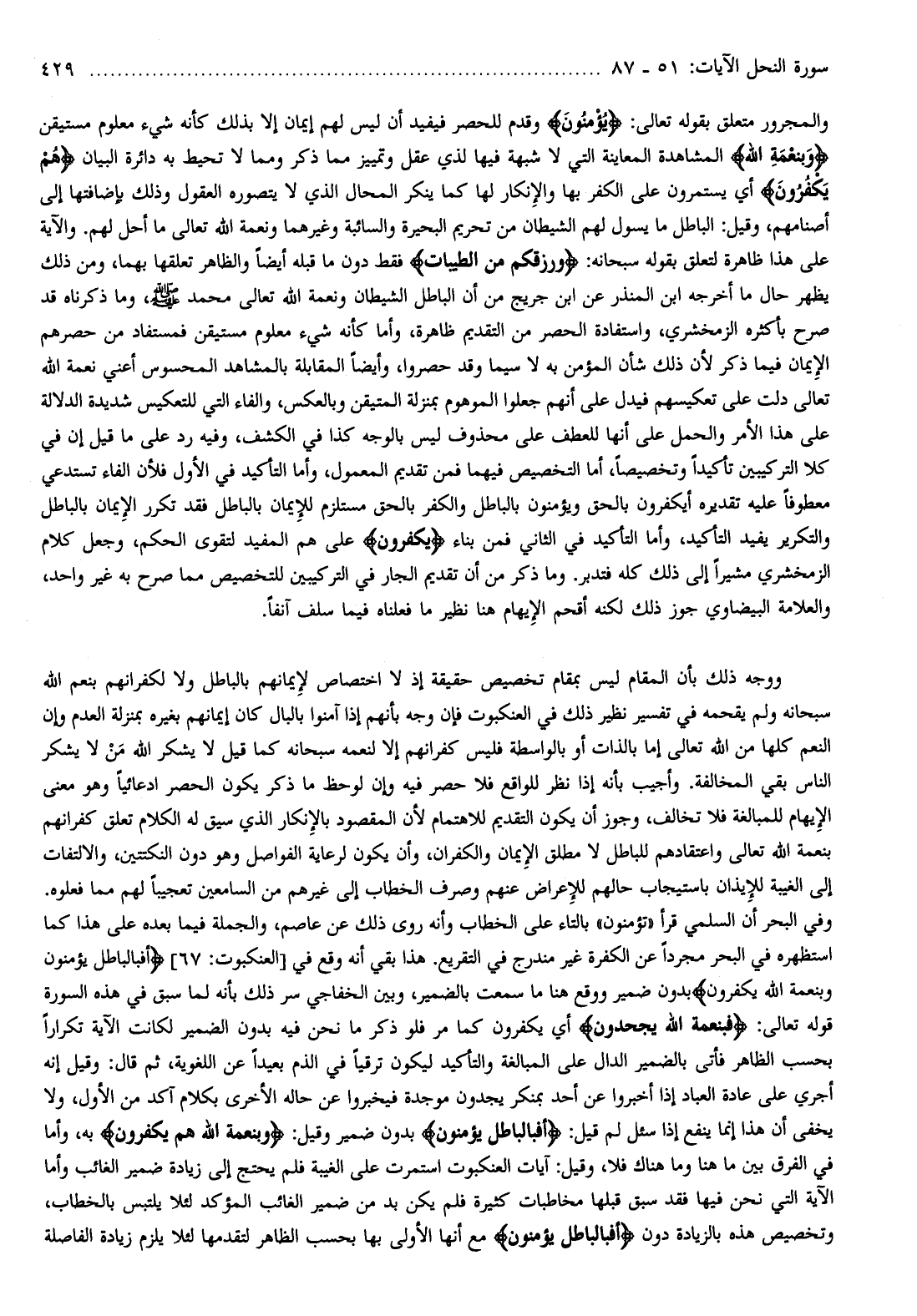 والمجرور متعلق بقوله تعالى: يُؤْمِنُونَ وقدم للحصر فيفيد أن ليس لهم إيمان إلا بذلك كأنه شيء معلوم مستيقن وَبِنِعْمَةِ اللَّهِ المشاهدة المعاينة التي لا شبهة فيها لذي عقل وتمييز مما ذكر ومما لا تحيط به دائرة البيان هُمْ يَكْفُرُونَ أي يستمرون على الكفر بها والإنكار لها كما ينكر المحال الذي لا يتصوره العقول وذلك بإضافتها إلى أصنامهم، وقيل: الباطل ما يسول لهم الشيطان من تحريم البحيرة والسائبة وغيرهما ونعمة الله تعالى ما أحل لهم. والآية على هذا ظاهرة لتعلق بقوله سبحانه: وَرَزَقَكُمْ مِنَ الطَّيِّباتِ فقط دون ما قبله أيضا والظاهر تعلقها بهما، ومن ذلك يظهر حال من أخرجه ابن المنذر عن ابن جريج من أن الباطل الشيطان ونعمة الله تعالى محمد صلى الله عليه وسلم، وما ذكرناه قد صرح بأكثره الزمخشري، واستفادة الحصر من التقديم ظاهرة، وأما كأنه شيء معلوم مستيقن فمستفاد من حصرهم الإيمان فيما ذكر لأن ذلك شأن المؤمن به لا سيما وقد حصروا، وأيضا المقابلة بالمشاهد المحسوس أعني نعمة الله تعالى دلت على تعكيسهم فيدل على أنهم جعلوا الموهوم بمنزلة المتيقن وبالعكس، والفاء التي للتعكيس شديدة الدلالة على هذا الأمر والحمل على أنها للعطف على محذوف ليس بالوجه كذا في الكشف، وفيه رد على ما قيل إن في كلا التركيبين تأكيدا وتخصيصا، أما التخصيص فيهما فمن تقديم المعمول، وأما التأكيد في الأول فلأن الفاء تستدعي معطوفا عليه تقديره أيكفرون بالحق ويؤمنون بالباطل والكفر بالحق مستلزم للإيمان بالباطل فقد تكرر الإيمان بالباطل والتكرير يفيد التأكيد، وأما التأكيد في الثاني فمن بناء يَكْفُرُونَ على هم المفيد لتقوى الحكم، وجعل كلام الزمخشري مشيرا إلى ذلك كله فتدبر. وما ذكر من أن تقديم الجار في التركيبين للتخصيص مما صرح به غير واحد، والعلامة البيضاوي جوز ذلك لكنه أقحم الإيهام هنا نظير ما فعلناه فيما سلف آنفا.