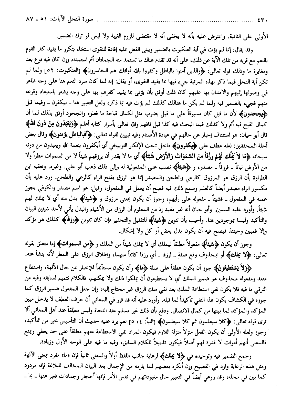 وقد يقال: إنما لم يؤت في آية العنكبوت بالضمير ويبنى الفعل عليه إفادة للتقوى استغناء بتكرر ما يفيد كفر القوم بالنعم مع قربه من تلك الآية عن ذلك، على أنه قد تقدم هناك ما تستمد منه الجملتان أتم استمداد وإن كان فيه نوع بعد ومغايرة ما وذلك قوله تعالى: وَالَّذِينَ آمَنُوا بِالْباطِلِ وَكَفَرُوا بِاللَّهِ أُولئِكَ هُمُ الْخاسِرُونَ [العنكبوت: 52] ولما لم تكن آية النحل فيما ذكر بهذه المرتبة جيء فيها بما يفيد التقوى، أو يقال: إنه لما كان سرد النعم هنا على وجه ظاهر في وصولها إليهم والامتنان بها عليهم كان ذلك أوفق بأن يؤتى بما يفيد كفرهم بها على وجه يشعر باستبعاد وقوعه منهم فجيء بالضمير فيه ولما لم يكن ما هنالك كذلك لم يؤت فيه بما ذكر، ولعل التعبير هنا- بيكفرن- وفيما قبل يَجْحَدُونَ لأن ما قبل كان مسبوقا على ما قيل بضرب مثل لكمال قباحة ما فعلوه والجحود أوفق بذلك لما أن كمال القبح فيه أتم ولا كذلك فيما البحث فيه كذا قيل فافهم والله تعالى بأسرار كتابه أعلم وَيَعْبُدُونَ مِنْ دُونِ اللَّهِ قال أبو حيان: هو استئناف إخبار عن حالهم في عبادة الأصنام وفيه تبيين لقوله تعالى: أَفَبِالْباطِلِ يُؤْمِنُونَ وقال بعض أجلة المحققين: لعله عطف على يَكْفُرُونَ داخل تحت الإنكار التوبيخي أي أيكفرون بنعمة الله ويعبدون من دونه سبحانه ما لا يَمْلِكُ لَهُمْ رِزْقاً مِنَ السَّماواتِ وَالْأَرْضِ شَيْئاً أي ما لا يقدر أن يرزقهم شيئا لا من السموات مطرا ولا من الأرض نباتا- فرزقا- مصدر، وشَيْئاً نصب على المفعولية له وإلى ذلك ذهب أبو علي. وغيره. وتعقبه ابن الطراوة بأن الرزق هو المرزوق كالرعي والطحن والمصدر إنما هو الرزق بفتح الراء كالرعي والطحن. ورد عليه بأن مكسور الراء مصدر أيضا كالعلم وسمع ذلك فيه فصح أن يعمل في المفعول، وقيل: هو اسم مصدر والكوفي يجوز عمله في المفعول- فشيئا- مفعوله على رأيهم، وجوز أن يكون بمعنى مرزوق وشَيْئاً بدل منه أي لا يملك لهم شيئا. وأورد عليه السمين. وأبو حيان أنه غير مفيد إذ من المعلوم أن الرزق من الأشياء والبدل يأتي لأحد شيئين البيان والتأكيد وليسا بموجودين هنا. وأجيب بأن تنوين شَيْئاً للتقليل والتحقير فإن كان تنوين رِزْقاً كذلك هو مؤكد وإلا فمبين وحينئذ فيصح فيه أن يكون بدل بعض أو كل ولا إشكال.