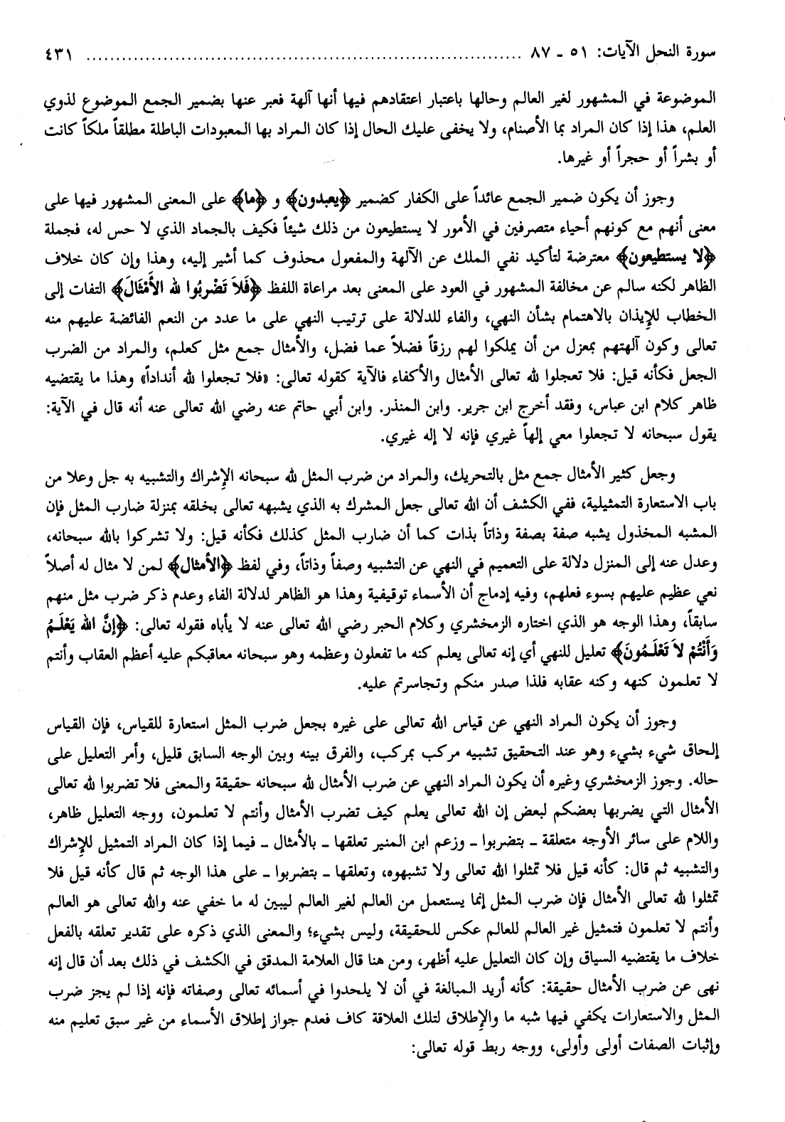 وجوز أن يكون المراد النهي عن قياس الله تعالى على غيره بجعل ضرب المثل استعارة للقياس، فإن القياس إلحاق شيء بشيء وهو عند التحقيق تشبيه مركب بمركب، والفرق بينه وبين الوجه السابق قليل، وأمر التعليل على حاله. وجوز الزمخشري وغيره أن يكون المراد النهي عن ضرب الأمثال لله سبحانه حقيقة والمعنى فلا تضربوا لله تعالى الأمثال التي يضربها بعضكم لبعض إن الله تعالى يعلم كيف تضرب الأمثال وأنتم لا تعلمون، ووجه التعليل ظاهر، واللام على سائر الأوجه متعلقة- بتضربوا- وزعم ابن المنير تعلقها- بالأمثال- فيما إذا كان المراد التمثيل للإشراك والتشبيه ثم قال: كأنه قيل فلا تمثلوا الله تعالى ولا تشبهوه، وتعلقها- بتضربوا- على هذا الوجه ثم قال كأنه قيل فلا تمثلوا لله تعالى الأمثال فإن ضرب المثل إنما يستعمل من العالم لغير العالم ليبين له ما خفي عنه والله تعالى هو العالم وأنتم لا تعلمون فتمثيل غير العالم للعالم عكس للحقيقة، وليس بشيء والمعنى الذي ذكره على تقدير تعلقه بالفعل خلاف ما يقتضيه السياق وإن كان التعليل عليه أظهر، ومن هنا قال العلامة المدقق في الكشف في ذلك بعد أن قال إنه نهى عن ضرب الأمثال حقيقة: كأنه أريد المبالغة في أن لا يلحدوا في أسمائه تعالى وصفاته فإنه إذا لم يجز ضرب المثل والاستعارات يكفي فيها شبه ما والإطلاق لتلك العلاقة كاف فعدم جواز إطلاق الأسماء من غير سبق تعليم منه وإثبات الصفات أولى وأولى، ووجه ربط قوله تعالى: