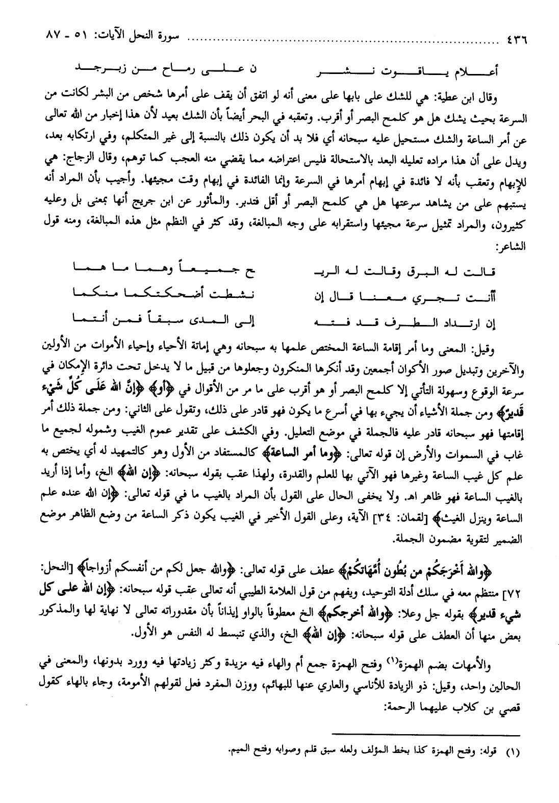 72] منتظم معه في سلك أدلة التوحيد، ويفهم من قول العلامة الطيبي أنه تعالى عقب قوله سبحانه: إِنَّ اللَّهَ عَلى كُلِّ شَيْءٍ قَدِيرٌ بقوله جل وعلا: وَاللَّهُ أَخْرَجَكُمْ إلخ معطوفا بالواو إيذانا بأن مقدوراته تعالى لا نهاية لها والمذكور بعض منها أن العطف على قوله سبحانه: إِنَّ اللَّهَ إلخ، والذي تنبسط له النفس هو الأول.