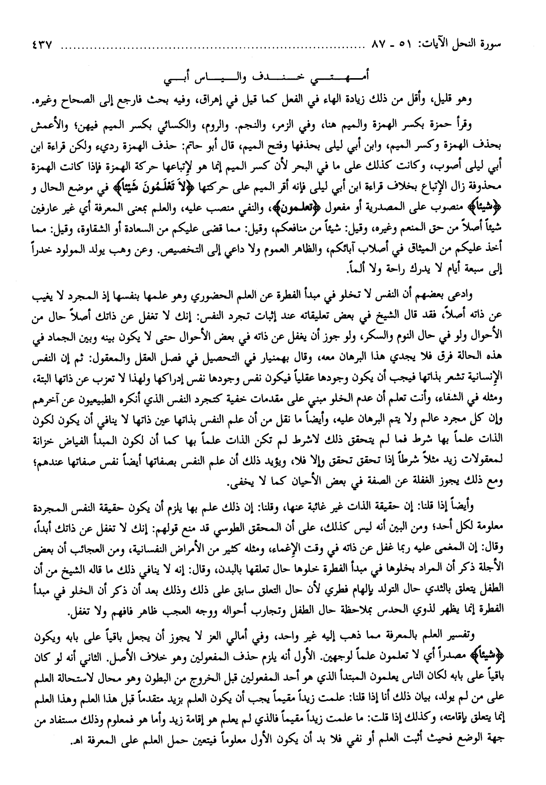 وتفسير العلم بالمعرفة مما ذهب إليه غير واحد، وفي أمالي العز لا يجوز أن يجعل باقيا على بابه ويكون شَيْئاً مصدرا أي لا تعلمون علما لوجهين. الأول أنه يلزم حذف المفعولين وهو خلاف الأصل. الثاني أنه لو كان باقيا على بابه لكان الناس يعلمون المبتدأ الذي هو أحد المفعولين قبل الخروج من البطون وهو محال لاستحالة العلم على من لم يولد، بيان ذلك أنا إذا قلنا: علمت زيدا مقيما يجب أن يكون العلم بزيد متقدما قبل هذا العلم وهذا العلم إنما يتعلق بإقامته، وكذلك إذا قلت: ما علمت زيدا مقيما فالذي لم يعلم هو إقامة زيد وأما هو فمعلوم وذلك مستفاد من جهة الوضع فحيث أثبت العلم أو نفي فلا بد أن يكون الأول معلوما فيتعين حمل العلم على المعرفة اه.