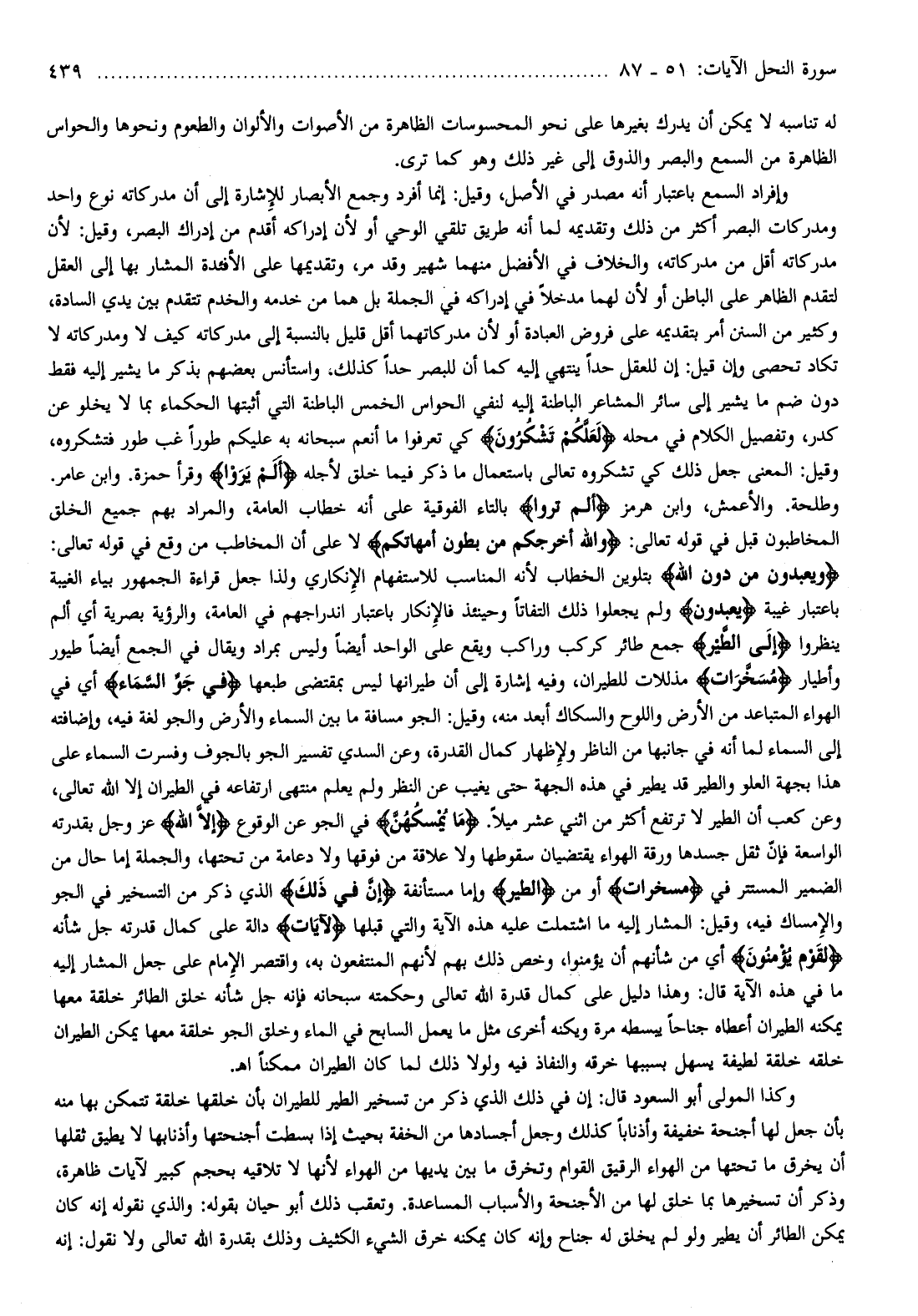 وكذا المولى أبو السعود قال: إن في ذلك الذي ذكر من تسخير الطير للطيران بأن خلقها خلقة تتمكن بها منه بأن جعل لها أجنحة خفيفة وأذنابا كذلك وجعل أجسادها من الخفة بحيث إذا بسطت أجنحتها وأذنابها لا يطيق ثقلها أن يخرق ما تحتها من الهواء الرقيق القوام وتخرق ما بين يديها من الهواء لأنها لا تلاقيه بحجم كبير لآيات ظاهرة، وذكر أن تسخيرها بما خلق لها من الأجنحة والأسباب المساعدة. وتعقب ذلك أبو حيان بقوله: والذي نقوله إنه كان يمكن الطائر أن يطير ولو لم يخلق له جناح وإنه كان يمكنه خرق الشيء الكثيف وذلك بقدرة الله تعالى ولا نقول: إنه