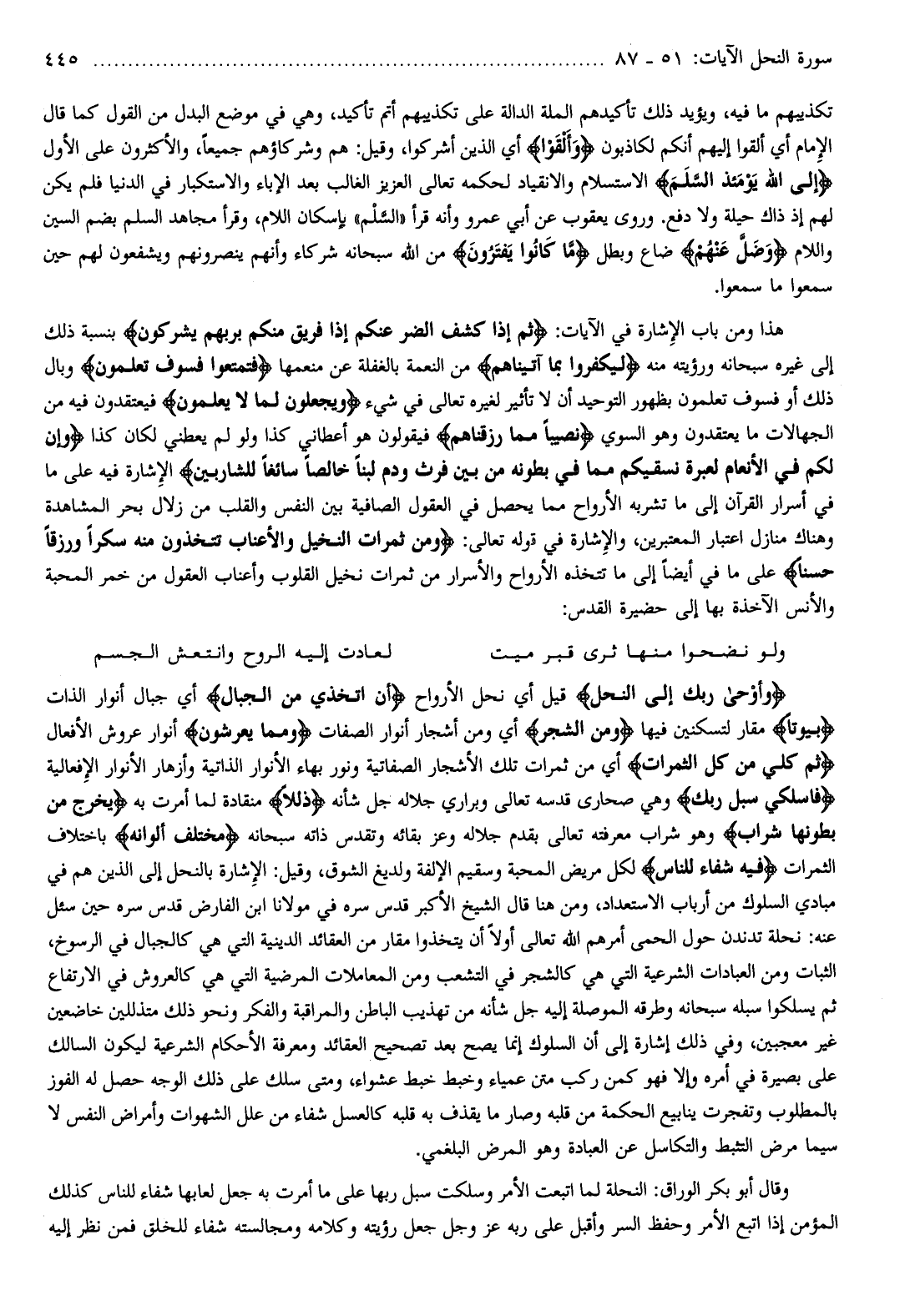 وَأَوْحى رَبُّكَ إِلَى النَّحْلِ قيل أي نحل الأرواح أَنِ اتَّخِذِي مِنَ الْجِبالِ أي جبال أنوار الذات بُيُوتاً مقار لتسكنين فيها وَمِنَ الشَّجَرِ أي ومن أشجار أنوار الصفات وَمِمَّا يَعْرِشُونَ أنوار عروش الأفعال ثُمَّ كُلِي مِنْ كُلِّ الثَّمَراتِ أي من ثمرات تلك الأشجار الصفاتية ونور بهاء الأنوار الذاتية وأزهار الأنوار الإفعالية فَاسْلُكِي سُبُلَ رَبِّكِ وهي صحارى قدسه تعالى وبراري جلاله جل شأنه ذُلُلًا منقادة لما أمرت به يَخْرُجُ مِنْ بُطُونِها شَرابٌ وهو شراب معرفته تعالى بقدم جلاله وعز بقائه وتقدس ذاته سبحانه مُخْتَلِفٌ أَلْوانُهُ باختلاف الثمرات فِيهِ شِفاءٌ لِلنَّاسِ لكل مريض المحبة وسقيم الإلفة ولديغ الشوق، وقيل: الإشارة بالنحل إلى الذين هم في مبادي السلوك من أرباب الاستعداد، ومن هنا قال الشيخ الأكبر قدس سره في مولانا ابن الفارض قدس سره حين سئل عنه: نحلة تدندن حول الحمى أمرهم الله تعالى أولا أن يتخذوا مقار من العقائد الدينية التي هي كالجبال في الرسوخ، الثبات ومن العبادات الشرعية التي هي كالشجر في التشعب ومن المعاملات المرضية التي هي كالعروش في الارتفاع ثم يسلكوا سبله سبحانه وطرقه الموصلة إليه جل شأنه من تهذيب الباطن والمراقبة والفكر ونحو ذلك متذللين خاضعين غير معجبين، وفي ذلك إشارة إلى أن السلوك إنما يصح بعد تصحيح العقائد ومعرفة الأحكام الشرعية ليكون السالك على بصيرة في أمره وإلا فهو كمن ركب متن عمياء وخبط خبط عشواء، ومتى سلك على ذلك الوجه حصل له الفوز بالمطلوب وتفجرت ينابيع الحكمة من قلبه وصار ما يقذف به قلبه كالعسل شفاء من علل الشهوات وأمراض النفس لا سيما مرض التثبط والتكاسل عن العبادة وهو المرض البلغمي.