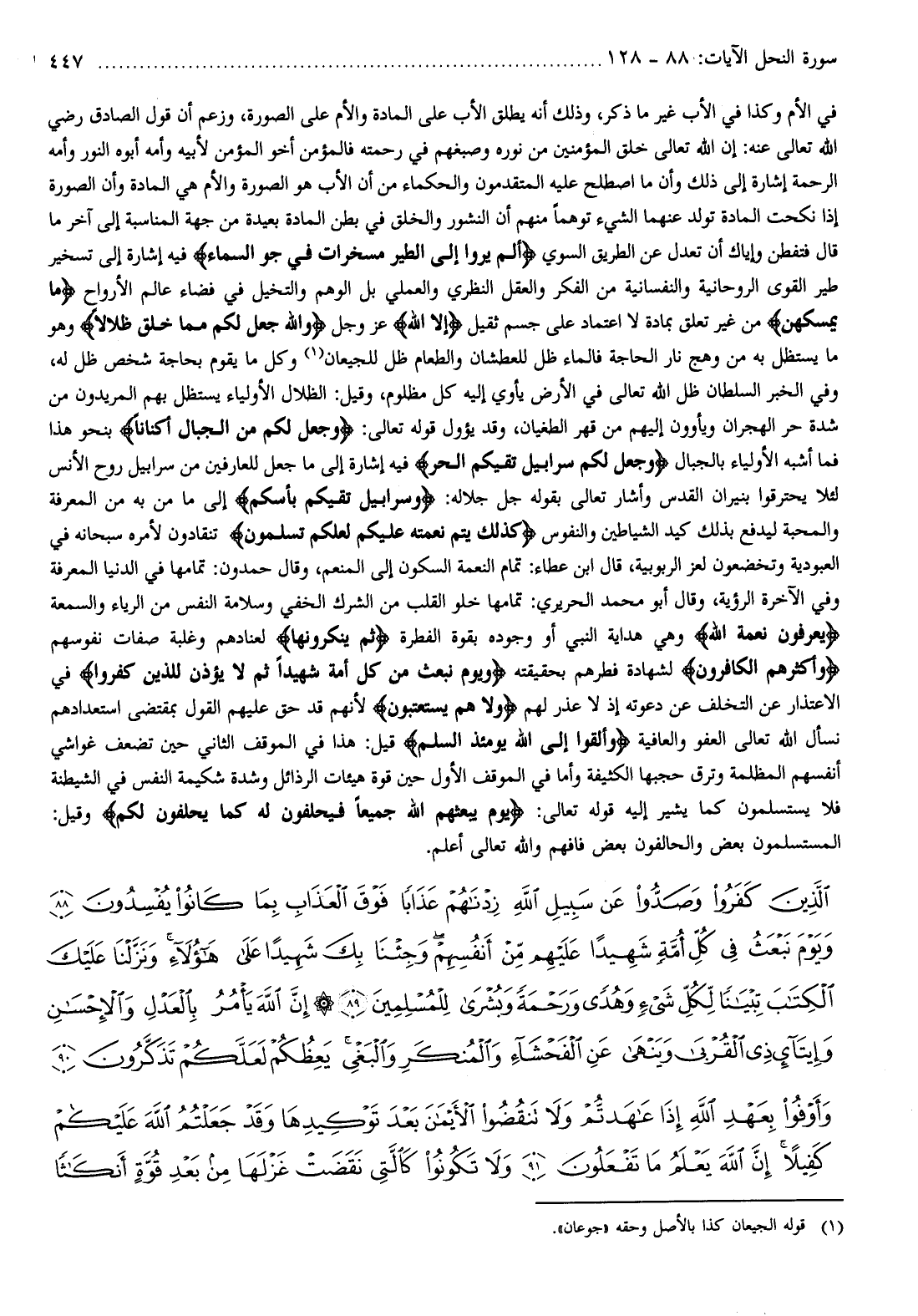 في الأم وكذا في الأب غير ما ذكر، وذلك أنه يطلق الأب على المادة والأم على الصورة، وزعم أن قول الصادق رضي الله تعالى عنه: إن الله تعالى خلق المؤمنين من نوره وصبغهم في رحمته فالمؤمن أخو المؤمن لأبيه وأمه أبوه النور وأمه الرحمة إشارة إلى ذلك وأن ما اصطلح عليه المتقدمون والحكماء من أن الأب هو الصورة والأم هي المادة وأن الصورة إذا نكحت المادة تولد عنهما الشيء توهما منهم أن النشور والخلق في بطن المادة بعيدة من جهة المناسبة إلى آخر ما قال فتفطن وإياك أن تعدل عن الطريق السوي أَلَمْ يَرَوْا إِلَى الطَّيْرِ مُسَخَّراتٍ فِي جَوِّ السَّماءِ فيه إشارة إلى تسخير طير القوى الروحانية والنفسانية من الفكر والعقل النظري والعملي بل الوهم والتخيل في فضاء عالم الأرواح ما يُمْسِكُهُنَّ من غير تعلق بمادة لا اعتماد على جسم ثقيل إِلَّا اللَّهُ عز وجل وَاللَّهُ جَعَلَ لَكُمْ مِمَّا خَلَقَ ظِلالًا وهو ما يستظل به من وهج نار الحاجة فالماء ظل للعطشان والطعام ظل للجيعان (¬1) وكل ما يقوم بحاجة شخص ظل له، وفي الخبر السلطان ظل الله تعالى في الأرض يأوي إليه كل مظلوم، وقيل: الظلال الأولياء يستظل بهم المريدون من شدة حر الهجران ويأوون إليهم من قهر الطغيان، وقد يؤول قوله تعالى: وَجَعَلَ لَكُمْ مِنَ الْجِبالِ أَكْناناً بنحو هذا فما أشبه الأولياء بالجبال وَجَعَلَ لَكُمْ سَرابِيلَ تَقِيكُمُ الْحَرَّ فيه إشارة إلى ما جعل للعارفين من سرابيل روح الأنس لئلا يحترقوا بنيران القدس وأشار تعالى بقوله جل جلاله: وَسَرابِيلَ تَقِيكُمْ بَأْسَكُمْ إلى ما من به من المعرفة والمحبة ليدفع بذلك كيد الشياطين والنفوس كَذلِكَ يُتِمُّ نِعْمَتَهُ عَلَيْكُمْ لَعَلَّكُمْ تُسْلِمُونَ تنقادون لأمره سبحانه في العبودية وتخضعون لعز الربوبية، قال ابن عطاء: تمام النعمة السكون إلى المنعم، وقال حمدون: تمامها في الدنيا المعرفة وفي الآخرة الرؤية، وقال أبو محمد الحريري: تمامها خلو القلب من الشرك الخفي وسلامة النفس من الرياء والسمعة يَعْرِفُونَ نِعْمَتَ اللَّهِ وهي هداية النبي أو وجوده بقوة الفطرة ثُمَّ يُنْكِرُونَها لعنادهم وغلبة صفات نفوسهم وَأَكْثَرُهُمُ الْكافِرُونَ لشهادة فطرهم بحقيقته وَيَوْمَ نَبْعَثُ مِنْ كُلِّ أُمَّةٍ شَهِيداً ثُمَّ لا يُؤْذَنُ لِلَّذِينَ كَفَرُوا في الاعتذار عن التخلف عن دعوته إذ لا عذر لهم وَلا هُمْ يُسْتَعْتَبُونَ لأنهم قد حق عليهم القول بمقتضى استعدادهم نسأل الله تعالى العفو والعافية وَأَلْقَوْا إِلَى اللَّهِ يَوْمَئِذٍ السَّلَمَ قيل: هذا في الموقف الثاني حين تضعف غواشي أنفسهم المظلمة وترق حجبها الكثيفة وأما في الموقف الأول حين قوة هيئات الرذائل وشدة شكيمة النفس في الشيطنة فلا يستسلمون كما يشير إليه قوله تعالى: يَوْمَ يَبْعَثُهُمُ اللَّهُ جَمِيعاً فَيَحْلِفُونَ لَهُ كَما يَحْلِفُونَ لَكُمْ وقيل: