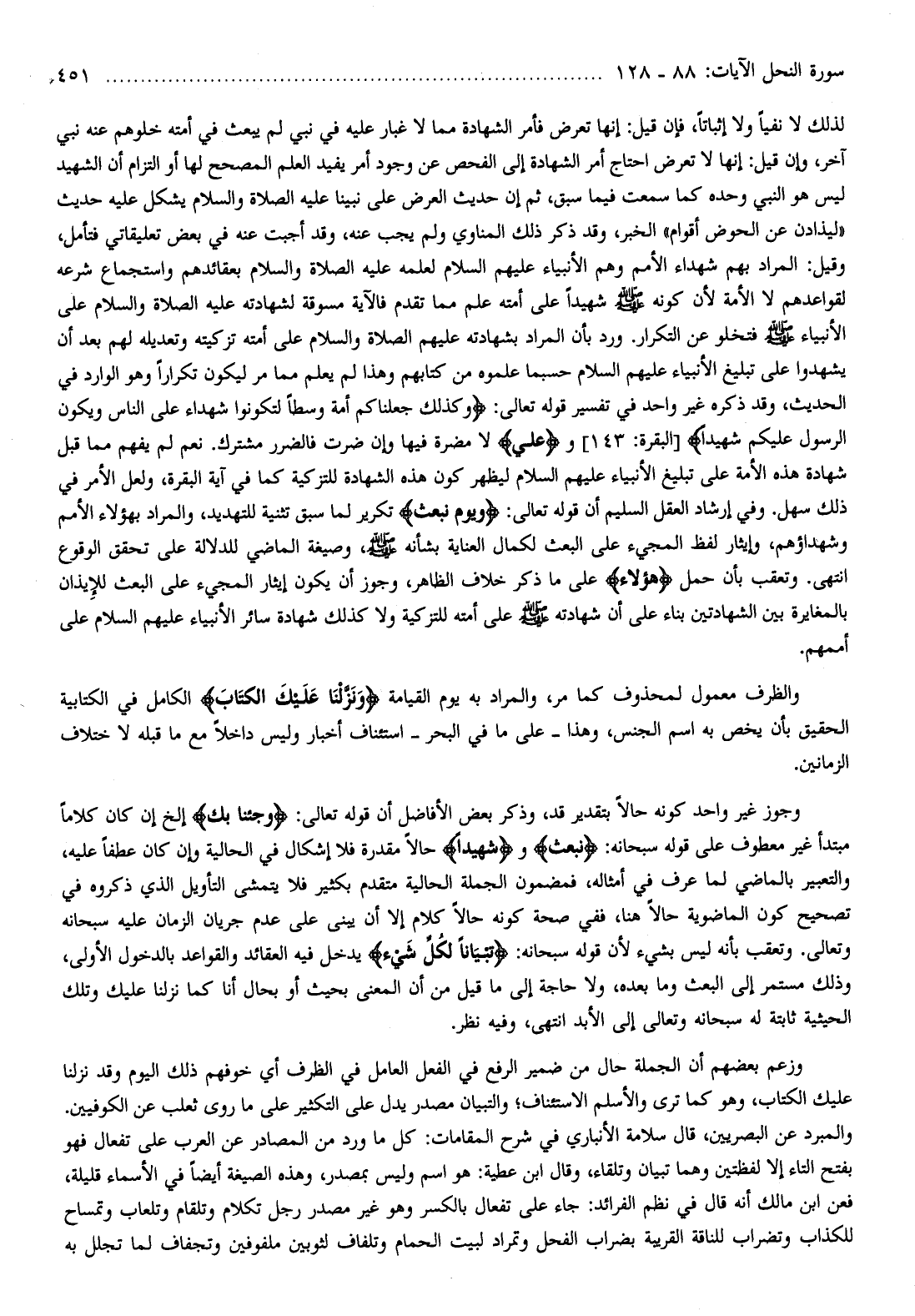 وجوز غير واحد كونه حالا بتقدير قد، وذكر بعض الأفاضل أن قوله تعالى: وَجِئْنا بِكَ إلخ إن كان كلاما مبتدأ غير معطوف على قوله سبحانه: نَبْعَثُ وشَهِيداً حالا مقدرة فلا إشكال في الحالية وإن كان عطفا عليه، والتعبير بالماضي لما عرف في أمثاله، فمضمون الجملة الحالية متقدم بكثير فلا يتمشى التأويل الذي ذكروه في تصحيح كون الماضوية حالا هنا، ففي صحة كونه حالا كلام إلا أن يبنى على عدم جريان الزمان عليه سبحانه وتعالى. وتعقب بأنه ليس بشيء لأن قوله سبحانه: تِبْياناً لِكُلِّ شَيْءٍ يدخل فيه العقائد والقواعد بالدخول الأولى، وذلك مستمر إلى البعث وما بعده، ولا حاجة إلى ما قيل من أن المعنى بحيث أو بحال أنا كما نزلنا عليك وتلك الحيثية ثابتة له سبحانه وتعالى إلى الأبد انتهى، وفيه نظر.
