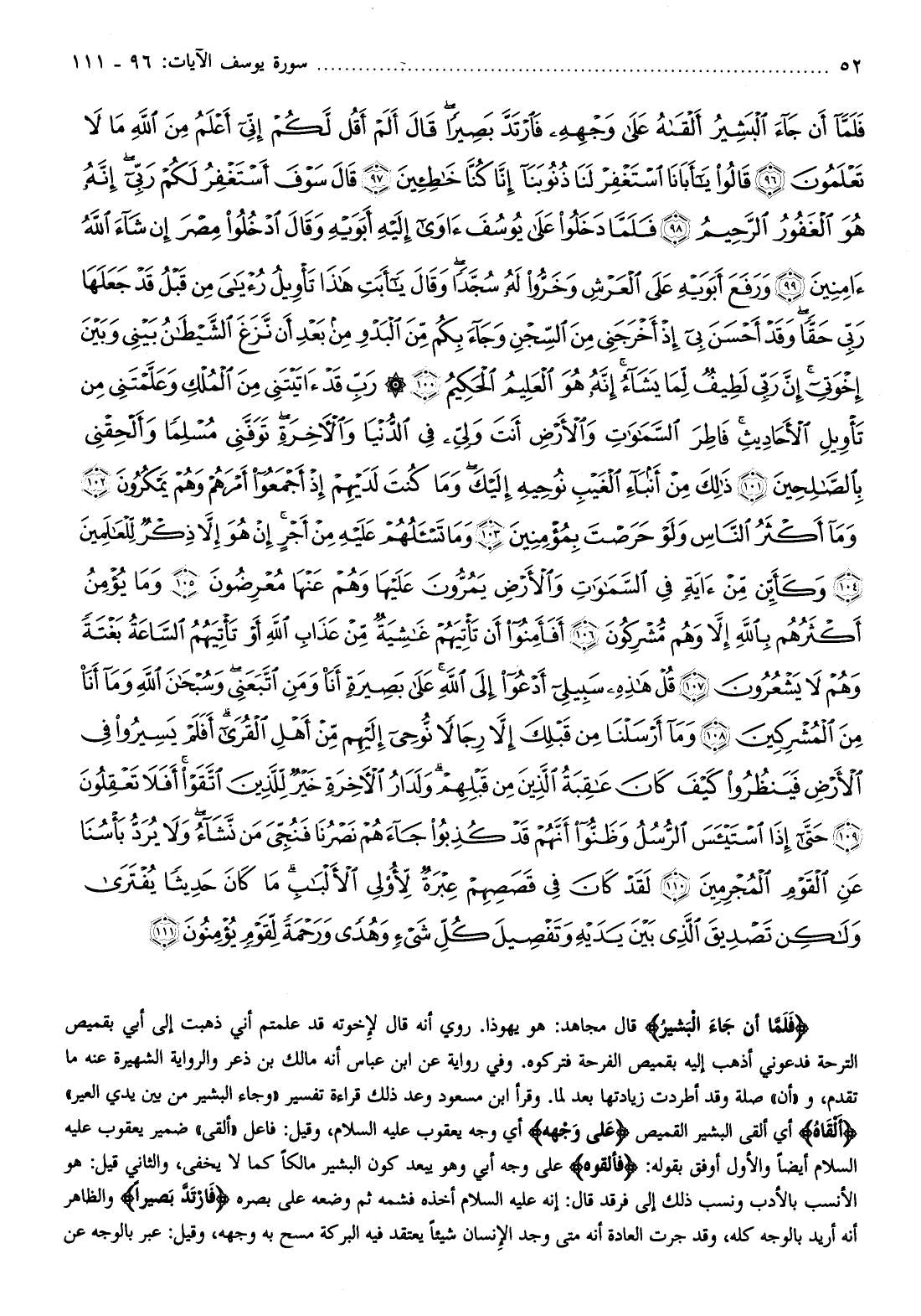 فَلَمَّا أَنْ جاءَ الْبَشِيرُ قال مجاهد: هو يهوذا. روي أنه قال لإخوته قد علمتم أني ذهبت إلى أبي بقميص الترحة فدعوني أذهب إليه بقميص الفرحة فتركوه. وفي رواية عن ابن عباس أنه مالك بن ذعر والرواية الشهيرة عنه ما تقدم، و «أن» صلة وقد أطردت زيادتها بعد لما. وقرأ ابن مسعود وعد ذلك قراءة تفسير «وجاء البشير من بين يدي العير» أَلْقاهُ أي ألقى البشير القميص عَلى وَجْهِهِ أي وجه يعقوب عليه السلام، وقيل: فاعل «ألقى» ضمير يعقوب عليه السلام أيضا والأول أوفق بقوله: فَأَلْقُوهُ على وجه أبي وهو يبعد كون البشير مالكا كما لا يخفى، والثاني قيل: هو الأنسب بالأدب ونسب ذلك إلى فرقد قال: إنه عليه السلام أخذه فشمه ثم وضعه على بصره فَارْتَدَّ بَصِيراً والظاهر أنه أريد بالوجه كله، وقد جرت العادة أنه متى وجد الإنسان شيئا يعتقد فيه البركة مسح به وجهه، وقيل: عبر بالوجه عن