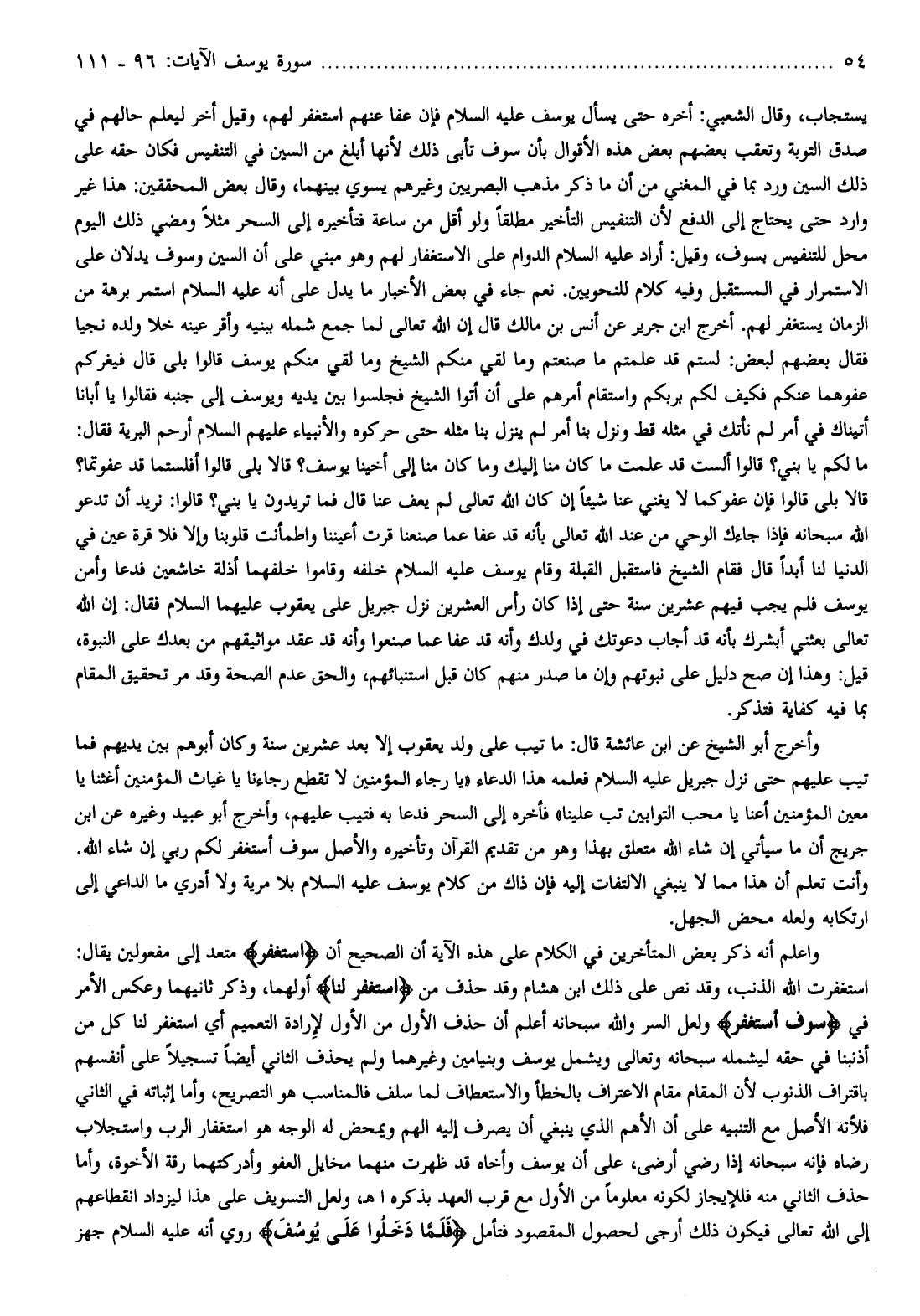 يستجاب، وقال الشعبي: أخره حتى يسأل يوسف عليه السلام فإن عفا عنهم استغفر لهم، وقيل أخر ليعلم حالهم في صدق التوبة وتعقب بعضهم بعض هذه الأقوال بأن سوف تأبى ذلك لأنها أبلغ من السين في التنفيس فكان حقه على ذلك السين ورد بما في المغني من أن ما ذكر مذهب البصريين وغيرهم يسوي بينهما، وقال بعض المحققين: هذا غير وارد حتى يحتاج إلى الدفع لأن التنفيس التأخير مطلقا ولو أقل من ساعة فتأخيره إلى السحر مثلا ومضي ذلك اليوم محل للتنفيس بسوف، وقيل: أراد عليه السلام الدوام على الاستغفار لهم وهو مبني على أن السين وسوف يدلان على الاستمرار في المستقبل وفيه كلام للنحويين. نعم جاء في بعض الأخبار ما يدل على أنه عليه السلام استمر برهة من الزمان يستغفر لهم.