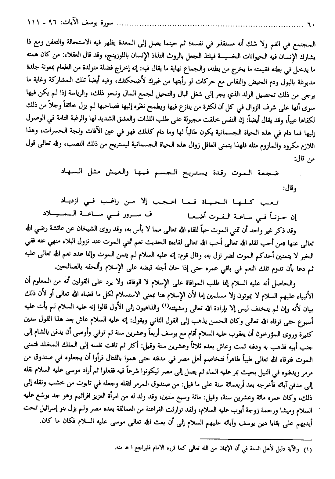 والحاصل أنه عليه السلام إنما طلب الموافاة على الإسلام لا الوفاة، ولا يرد على القولين أنه من المعلوم أن الأنبياء عليهم السلام لا يموتون إلا مسلمين إما لأن الإسلام هنا بمعنى الاستسلام لكل ما قضاه الله تعالى أو لأن ذلك بيان لأنه وإن لم يتخلف ليس إلا بإرادة الله تعالى ومشيئته (¬1) والذاهبون إلى الأول قالوا إنه عليه السلام لم يأت عليه أسبوع حتى توفاه الله تعالى وكان الحسن يذهب إلى القول الثاني ويقول: إنه عليه السلام عاش بعد هذا القول سنين كثيرة وروى المؤرخون أن يعقوب عليه السلام أقام مع يوسف أربعا وعشرين سنة ثم توفي وأوصى أن يدفن بالشام إلى جنب أبيه فذهب به ودفنه ثمت وعاش بعده ثلاثا وعشرين سنة وقيل: أكثر ثم تاقت نفسه إلى الملك المخلد فتمنى الموت فتوفاه الله تعالى طيبا طاهرا فتخاصم أهل مصر في مدفنه حتى هموا بالقتال فرأوا أن يجعلوه في صندوق من مرمر ويدفنوه في النيل بحيث يمر عليه الماء ثم يصل إلى مصر ليكونوا شرعا فيه ففعلوا ثم أراد موسى عليه السلام نقله إلى مدفن آبائه فأخرجه بعد أربعمائة سنة على ما قيل: من صندوق المرمر لثقله وجعله في تابوت من خشب ونقله إلى ذلك، وكان عمره مائة وعشرين سنة، وقيل: مائة وسبع سنين، وقد ولد له من امرأة العزيز إفرائيم وهو جد يوشع عليه السلام وميشا ورحمة زوجة أيوب عليه السلام، ولقد توارثت الفراعنة من العمالقة بعده مصر ولم يزل بنو إسرائيل تحت أيديهم على بقايا دين يوسف وآبائه عليهم السلام إلى أن بعث الله تعالى موسى عليه السلام فكان ما كان.