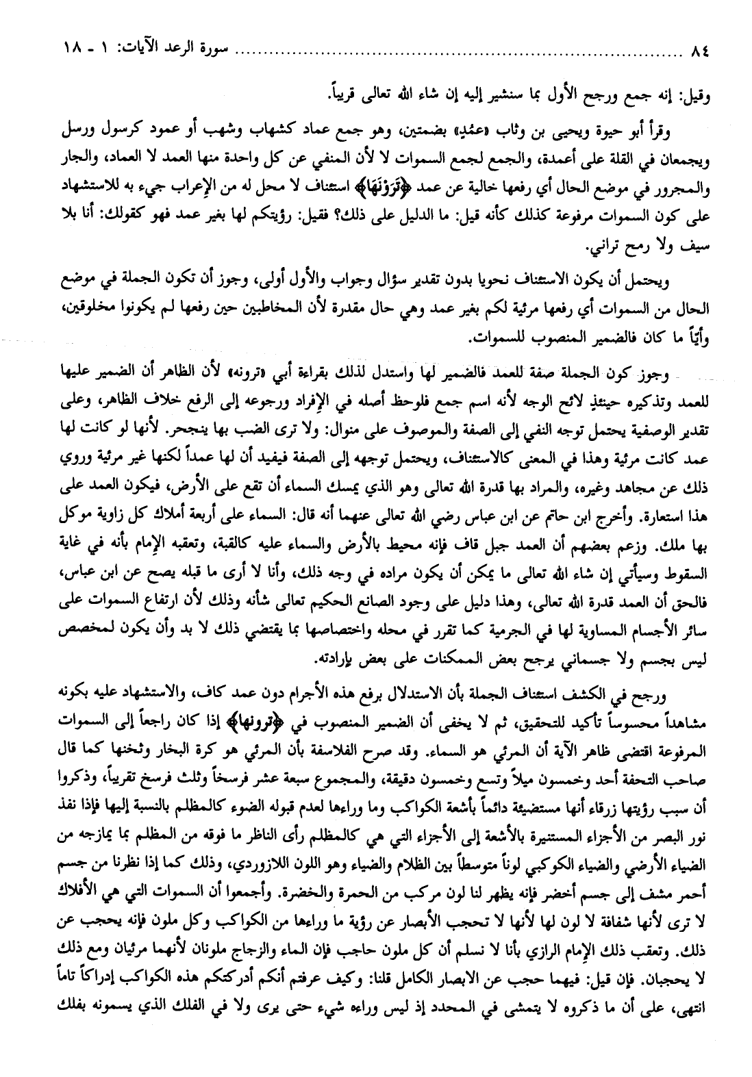 ورجح في الكشف استئناف الجملة بأن الاستدلال برفع هذه الأجرام دون عمد كاف، والاستشهاد عليه بكونه مشاهدا محسوسا تأكيد للتحقيق، ثم لا يخفى أن الضمير المنصوب في تَرَوْنَها إذا كان راجعا إلى السموات المرفوعة اقتضى ظاهر الآية أن المرئي هو السماء. وقد صرح الفلاسفة بأن المرئي هو كرة البخار وثخنها كما قال صاحب التحفة أحد وخمسون ميلا وتسع وخمسون دقيقة، والمجموع سبعة عشر فرسخا وثلث فرسخ تقريبا، وذكروا أن سبب رؤيتها زرقاء أنها مستضيئة دائما بأشعة الكواكب وما وراءها لعدم قبوله الضوء كالمظلم بالنسبة إليها فإذا نفذ نور البصر من الأجزاء المستنيرة بالأشعة إلى الأجزاء التي هي كالمظلم رأى الناظر ما فوقه من المظلم بما يمازجه من الضياء الأرضي والضياء الكوكبي لونا متوسطا بين الظلام والضياء وهو اللون اللازوردي، وذلك كما إذا نظرنا من جسم أحمر مشف إلى جسم أخضر فإنه يظهر لنا لون مركب من الحمرة والخضرة. وأجمعوا أن السموات التي هي الأفلاك لا ترى لأنها شفافة لا لون لها لأنها لا تحجب الأبصار عن رؤية ما وراءها من الكواكب وكل ملون فإنه يحجب عن ذلك. وتعقب ذلك الإمام الرازي بأنا لا نسلم أن كل ملون حاجب فإن الماء والزجاج ملونان لأنهما مرئيان ومع ذلك لا يحجبان. فإن قيل: فيهما حجب عن الابصار الكامل قلنا: وكيف عرفتم أنكم أدركتكم هذه الكواكب إدراكا تاما انتهى، على أن ما ذكروه لا يتمشى في المحدد إذ ليس وراءه شيء حتى يرى ولا في الفلك الذي يسمونه بفلك