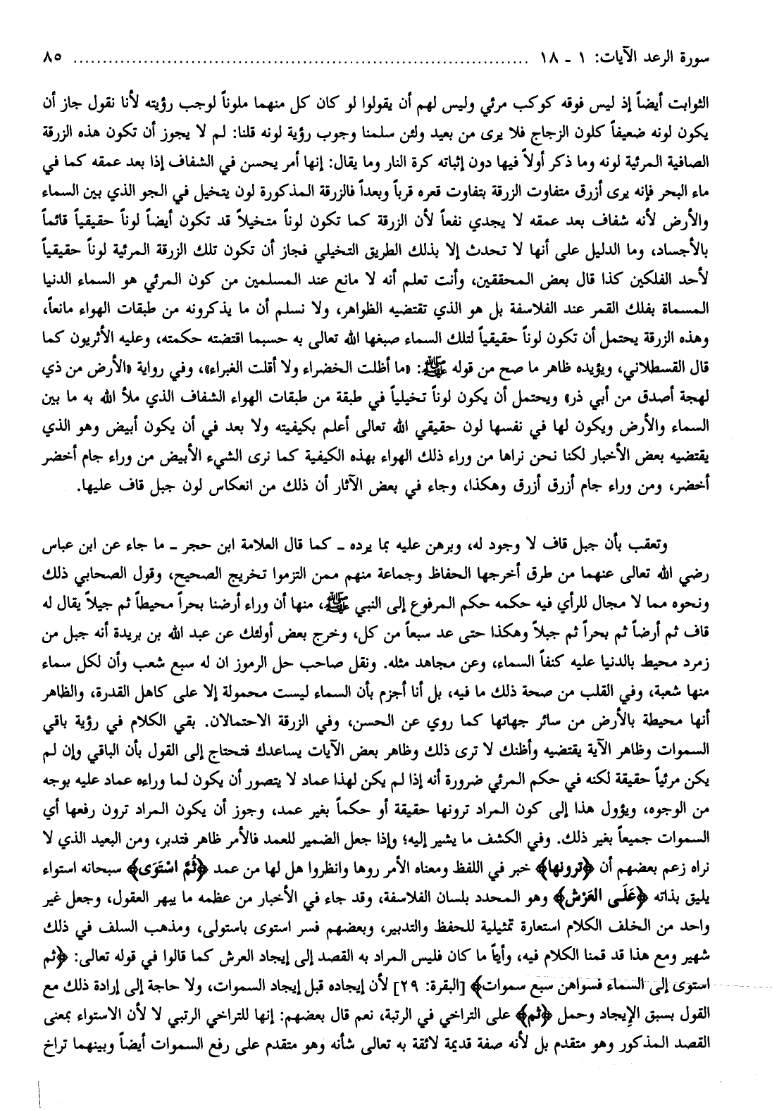 وتعقب بأن جبل قاف لا وجود له، وبرهن عليه بما يرده- كما قال العلامة ابن حجر- ما جاء عن ابن عباس رضي الله تعالى عنهما من طرق أخرجها الحفاظ وجماعة منهم ممن التزموا تخريج الصحيح، وقول الصحابي ذلك ونحوه مما لا مجال للرأي فيه حكمه حكم المرفوع إلى النبي صلى الله عليه وسلم، منها أن وراء أرضنا بحرا محيطا ثم جيلا يقال له قاف ثم أرضا ثم بحرا ثم جبلا وهكذا حتى عد سبعا من كل، وخرج بعض أولئك عن عبد الله بن بريدة أنه جبل من زمرد محيط بالدنيا عليه كنفا السماء، وعن مجاهد مثله. ونقل صاحب حل الرموز ان له سبع شعب وأن لكل سماء منها شعبة، وفي القلب من صحة ذلك ما فيه، بل أنا أجزم بأن السماء ليست محمولة إلا على كاهل القدرة، والظاهر أنها محيطة بالأرض من سائر جهاتها كما روي عن الحسن، وفي الزرقة الاحتمالان. بقي الكلام في رؤية باقي السموات وظاهر الآية يقتضيه وأظنك لا ترى ذلك وظاهر بعض الآيات يساعدك فتحتاج إلى القول بأن الباقي وإن لم يكن مرئيا حقيقة لكنه في حكم المرئي ضرورة أنه إذا لم يكن لهذا عماد لا يتصور أن يكون لما وراءه عماد عليه بوجه من الوجوه، ويؤول هذا إلى كون المراد ترونها حقيقة أو حكما بغير عمد، وجوز أن يكون المراد ترون رفعها أي السموات جميعا بغير ذلك. وفي الكشف ما يشير إليه وإذا جعل الضمير للعمد فالأمر ظاهر فتدبر، ومن البعيد الذي لا نراه زعم بعضهم أن تَرَوْنَها خبر في اللفظ ومعناه الأمر روها وانظروا هل لها من عمد ثُمَّ اسْتَوى سبحانه استواء يليق بذاته عَلَى الْعَرْشِ وهو المحدد بلسان الفلاسفة، وقد جاء في الأخبار من عظمه ما يبهر العقول، وجعل غير واحد من الخلف الكلام استعارة تمثيلية للحفظ والتدبير، وبعضهم فسر استوى باستولى، ومذهب السلف في ذلك شهير ومع هذا قد قمنا الكلام فيه، وأيّا ما كان فليس المراد به القصد إلى إيجاد العرش كما قالوا في قوله تعالى: ثُمَّ اسْتَوى إِلَى السَّماءِ فَسَوَّاهُنَّ سَبْعَ سَماواتٍ [البقرة: 29] لأن إيجاده قبل إيجاد السموات، ولا حاجة إلى إرادة ذلك مع القول بسبق الإيجاد وحمل ثُمَّ على التراخي في الرتبة، نعم قال بعضهم: إنها للتراخي الرتبي لا لأن الاستواء بمعنى القصد المذكور وهو متقدم بل لأنه صفة قديمة لائقة به تعالى شأنه وهو متقدم على رفع السموات أيضا وبينهما تراخ