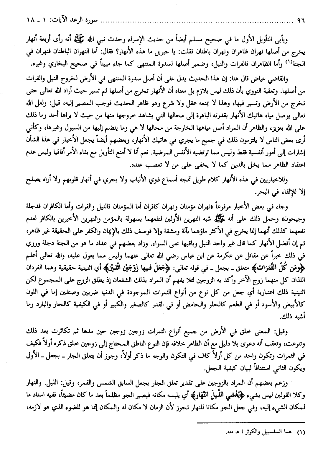 وحمل ذلك على أنه صلى الله عليه وسلم شبه النهرين الأولين لنفعهما بسهولة بالمؤمن والنهرين الأخيرين بالكافر لعدم نفعهما كذلك أنهما إنما يخرج في الأكثر ماؤهما بآلة ومشقة وإلا فوصف ذلك بالإيمان والكفر على الحقيقة غير ظاهر، ثم إن أفضل الأنهار كما قال غير واحد النيل وباقيها على السواء. وزاد بعضهم في عداد ما هو من الجنة دجلة وروي في ذلك خبرا عن مقاتل عن عكرمة عن ابن عباس رضي الله تعالى عنهما وليس مما يعول عليه، والله تعالى أعلم وَمِنْ كُلِّ الثَّمَراتِ متعلق- بجعل- في قوله تعالى: جَعَلَ فِيها زَوْجَيْنِ اثْنَيْنِ أي اثنينية حقيقية وهما الفردان اللذان كل منهما زوج الآخر وأكد به الزوجين لئلا يفهم أن المراد بذلك الشفعان إذ يطلق الزوج على المجموع لكن اثنينية ذلك اعتبارية أي جعل من كل نوع من أنواع الثمرات الموجودة في الدنيا ضربين وصنفين إما في اللون كالأبيض والأسود أو في الطعم كالحلو والحامض أو في القدر كالصغير والكبير أو في الكيفية كالحار والبارد وما أشبه ذلك.