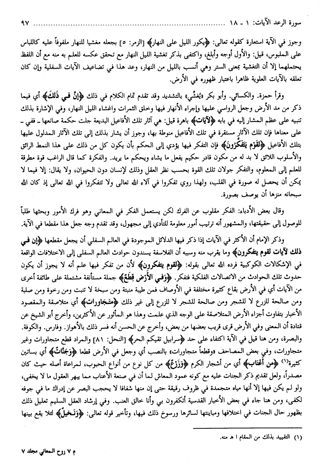 وذكر الإمام أن الأكثر في الآيات إذا ذكر فيها الدلائل الموجودة في العالم السفلي أن يجعل مقطعها إِنَّ فِي ذلِكَ لَآياتٍ لِقَوْمٍ يَتَفَكَّرُونَ وما يقرب منه وسببه أن الفلاسفة يسندون حوادث العالم السفلى إلى الاختلافات الواقعة في الإشكالات الكوكبية فرده الله تعالى بقوله: لِقَوْمٍ يَتَفَكَّرُونَ لأن من تفكر فيها علم أنه لا يجوز أن يكون حدوث تلك الحوادث من الاتصالات الفلكية فتفكر. وَفِي الْأَرْضِ قِطَعٌ جملة مستأنفة مشتملة على طائفة أخرى من الآيات أي في الأرض بقاع كثيرة مختلفة في الأوصاف فمن طيبة منبتة ومن سبخة لا تنبت ومن رخوة ومن صلبة ومن صالحة للزرع لا للشجر ومن صالحة للشجر لا للزرع إلى غير ذلك مُتَجاوِراتٌ أي متلاصقة والمقصود الأخبار بتفاوت أجزاء الأرض المتلاصقة على الوجه الذي علمت وهذا هو المأثور عن الأكثرين، وأخرج أبو الشيخ عن قتادة أن المعنى وفي الأرض قرى قريب بعضها من بعض، وأخرج عن الحسن أنه فسر ذلك بالأهواز. وفارس. والكوفة.