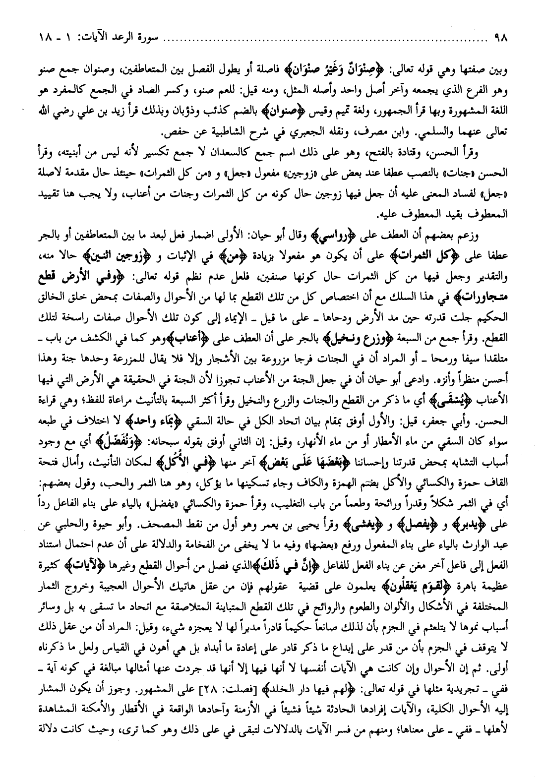 وزعم بعضهم أن العطف على رَواسِيَ وقال أبو حيان: الأولى إضمار فعل لبعد ما بين المتعاطفين أو بالجر عطفا على كُلِّ الثَّمَراتِ على أن يكون هو مفعولا بزيادة مِنْ في الإثبات وزَوْجَيْنِ اثْنَيْنِ حالا منه، والتقدير وجعل فيها من كل الثمرات حال كونها صنفين، فلعل عدم نظم قوله تعالى: وَفِي الْأَرْضِ قِطَعٌ مُتَجاوِراتٌ في هذا السلك مع أن اختصاص كل من تلك القطع بما لها من الأحوال والصفات بمحض خلق الخالق الحكيم جلت قدرته حين مد الأرض ودحاها- على ما قيل- الإيماء إلى كون تلك الأحوال صفات راسخة لتلك القطع. وقرأ جمع من السبعة وَزَرْعٌ وَنَخِيلٌ بالجر على أن العطف على أَعْنابٍ وهو كما في الكشف من باب- متلقدا سيفا ورمحا- أو المراد أن في الجنات فرجا مزروعة بين الأشجار وإلا فلا يقال للمزرعة وحدها جنة وهذا أحسن منظرا وأنزه. وادعى أبو حيان أن في جعل الجنة من الأعناب تجوزا لأن الجنة في الحقيقة هي الأرض التي فيها الأعناب يُسْقى أي ما ذكر من القطع والجنات والزرع والنخيل وقرأ أكثر السبعة بالتأنيث مراعاة للفظ وهي قراءة الحسن. وأبي جعفر، قيل: والأول أوفق بمقام بيان اتحاد الكل في حالة السقي بِماءٍ واحِدٍ لا اختلاف في طبعه سواء كان السقي من ماء الأمطار أو من ماء الأنهار، وقيل: إن الثاني أوفق بقوله سبحانه: وَنُفَضِّلُ أي مع وجود أسباب التشابه بمحض قدرتنا وإحساننا بَعْضَها عَلى بَعْضٍ آخر منها فِي الْأُكُلِ لمكان التأنيث، وأمال فتحة القاف حمزة والكسائي والأكل بضم الهمزة والكاف وجاء تسكينها ما يؤكل، وهو هنا الثمر والحب، وقول بعضهم: